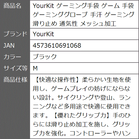 - バリエーションコード : 2b9pqw33h4商品コード2b9ps23c5o商品名ゲーミング手袋 ゲーム 手袋 ゲーミンググローブ 手汗 ゲーミング 滑り止め 通気性 メッシュ加工ブランドYourKitカラーブラックサイズ等M「快適な操作性」柔らかい生地を使用し、ゲームプレイの妨げにならない設計。サイクリングや登山、ランニングなど多用途で快適に使用できます。「優れたグリップ力」手のひらには滑り止め加工を施し、グリップ力を強化。コントローラーやハンドルをしっかり握れて、安定した操作が可能です。「しっかり固定」手首部分には面ファスナーを採用し、自由に調整可能。運動中のズレを防ぎ、常にフィット感をキープできます。※ 他ネットショップでも併売しているため、ご注文後に在庫切れとなる場合があります。予めご了承ください。※ 品薄または希少等の理由により、参考価格よりも高い価格で販売されている場合があります。ご注文の際には必ず販売価格をご確認ください。※ 沖縄県、離島または一部地域の場合、別途送料の負担をお願いする場合があります。予めご了承ください。※ お使いのモニタにより写真の色が実際の商品の色と異なる場合や、イメージに差異が生じることがあります。予めご了承ください。※ 商品の詳細(カラー・数量・サイズ 等)については、ページ内の商品説明をご確認のうえ、ご注文ください。※ モバイル版・スマホ版ページでは、お使いの端末によっては一部の情報が表示されないことがあります。すべての記載情報をご確認するには、PC版ページをご覧ください。