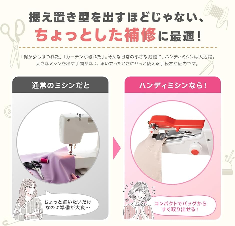 「手軽に使える電動ミニミシン」 ハンディミシンは、コンセント不要で片手操作が可能な電動タイプの小型ミシンです。