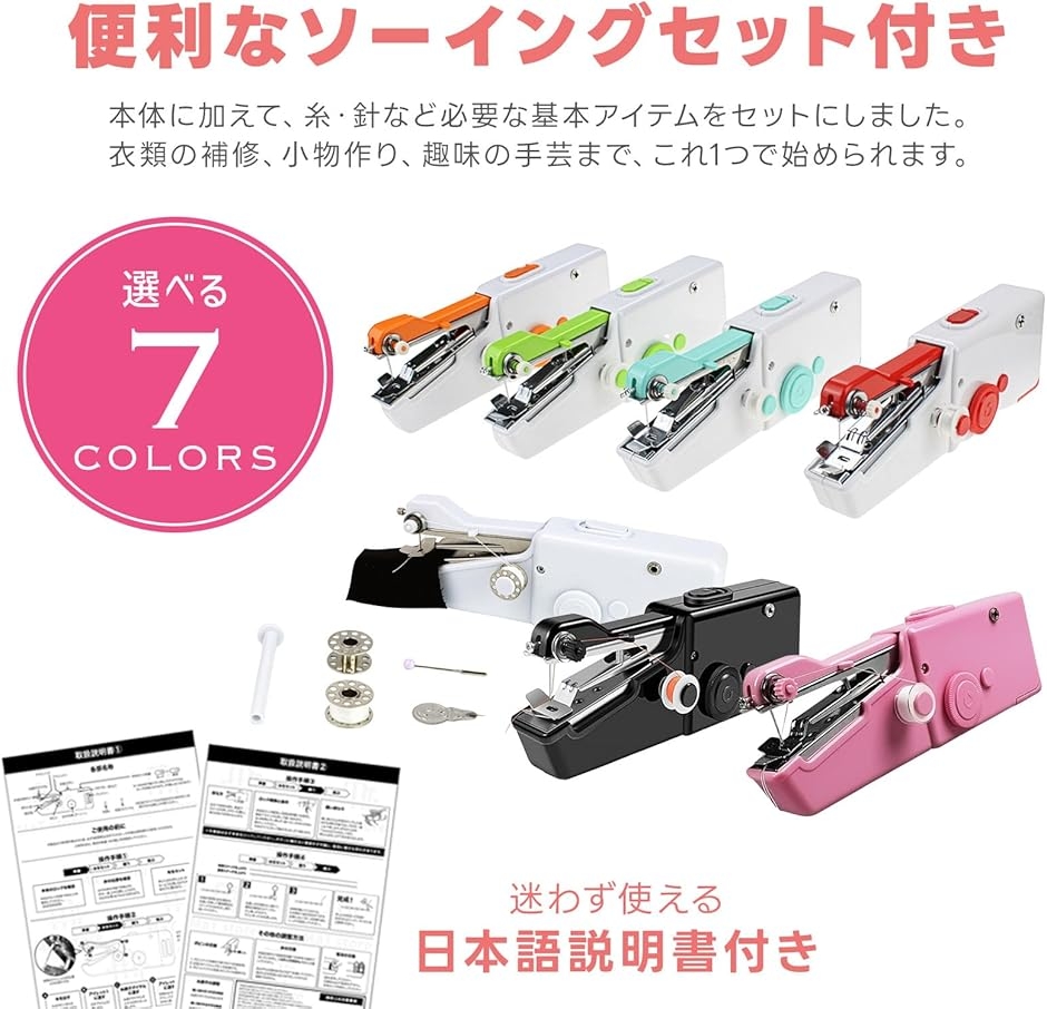 - バリエーションコード : 2bu3v0vyig商品コード2buvls6jh3商品名ハンディミシン 小型 ハンドミシン コンパクト ミニ 初心者 裁縫ブランドMaT storeカラーピンク「手軽に使える電動ミニミシン」 ハンディミシンは、コンセント不要で片手操作が可能な電動タイプの小型ミシンです。初心者でも扱いやすく、日常のちょっとした裁縫や補修作業にぴったり。準備や片付けの手間が少なく、時間がないときでもすぐに使用できます。「持ち運びやすいコンパクト設計」 軽量かつスリムな設計のため、収納場所を選ばず持ち運びにも便利です。旅行先や出張中の衣類トラブルにも対応でき、自宅以外でも活躍の場が広がります。バッグや引き出しにもすっきり収まり、必要なときにすぐ取り出せるのが特長です。「裁縫初心者にも最適」 複雑な操作がなく、スイッチひとつで縫製がスタートできるため、これから裁縫を始めたい方にもおすすめです。布地をガイドに沿って動かすだけで直線縫いができるため、失敗が少なく安心して使えます。子どもや学生の家庭科学習にも適しています。「便利なソーイングセット付き」 本体に加えて、糸や針などの裁縫に必要な基本アイテムがセットになっています。届いたその日からすぐに使用可能で、ギフトとしても喜ばれる実用性の高いアイテムです。衣類の補修、小物作り、趣味の手芸など幅広く活用できます。「商品詳細」 ・本体サイズ:画像参照 ・電源方式:単三電池4本(別売) ・セット内容:本体、ソーイングセット ・対応素材:薄手の布、綿、デニム(2枚重ね程度)※ 他ネットショップでも併売しているため、ご注文後に在庫切れとなる場合があります。予めご了承ください。※ 品薄または希少等の理由により、参考価格よりも高い価格で販売されている場合があります。ご注文の際には必ず販売価格をご確認ください。※ 沖縄県、離島または一部地域の場合、別途送料の負担をお願いする場合があります。予めご了承ください。※ お使いのモニタにより写真の色が実際の商品の色と異なる場合や、イメージに差異が生じることがあります。予めご了承ください。※ 商品の詳細(カラー・数量・サイズ 等)については、ページ内の商品説明をご確認のうえ、ご注文ください。※ モバイル版・スマホ版ページでは、お使いの端末によっては一部の情報が表示されないことがあります。すべての記載情報をご確認するには、PC版ページをご覧ください。