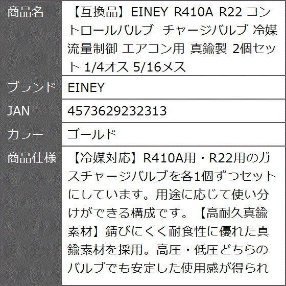 「商品詳細」内容物:R22用x1、R410A用x1、素材:真鍮、接続口:1/4オスx1/4メス・1/4オスx5/16メス。