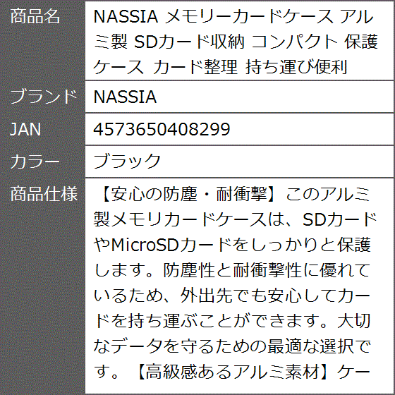 - バリエーションコード : 2buurls9v1商品コード2buurgq2ug商品名メモリーカードケース アルミ製 SDカード収納 コンパクト 保護ケース カード整理 持ち運び便利ブランドNASSIAカラーブラック「安心の防塵・耐衝撃」このアルミ製メモリカードケースは、SDカードやMicroSDカードをしっかりと保護します。防塵性と耐衝撃性に優れているため、外出先でも安心してカードを持ち運ぶことができます。大切なデータを守るための最適な選択です。「高級感あるアルミ素材」ケースは高品質なアルミ素材で作られており、見た目にも高級感があります。耐久性が高く、長期間にわたって使用可能。ビジネスシーンでもプライベートでも、スタイリッシュにカードを管理できます。「軽量で持ち運びやすい」わずかの重量で、バッグやポケットに簡単に収納可能。旅行や出張、日常の持ち運びにも最適です。軽量でありながら、しっかりとした作りでカードを保護します。「簡単なアクセス」カードの出し入れがスムーズに行える設計。急いでいるときでも、必要なカードをすぐに取り出せるので、ストレスフリーな使用感を提供します。効率的な作業をサポートします。※ 他ネットショップでも併売しているため、ご注文後に在庫切れとなる場合があります。予めご了承ください。※ 品薄または希少等の理由により、参考価格よりも高い価格で販売されている場合があります。ご注文の際には必ず販売価格をご確認ください。※ 沖縄県、離島または一部地域の場合、別途送料の負担をお願いする場合があります。予めご了承ください。※ お使いのモニタにより写真の色が実際の商品の色と異なる場合や、イメージに差異が生じることがあります。予めご了承ください。※ 商品の詳細(カラー・数量・サイズ 等)については、ページ内の商品説明をご確認のうえ、ご注文ください。※ モバイル版・スマホ版ページでは、お使いの端末によっては一部の情報が表示されないことがあります。すべての記載情報をご確認するには、PC版ページをご覧ください。高級感のあるアルミ製メモリカードケース。SDカードやmicroSDカードをしっかり収納・保護できます。耐衝撃・防水・防塵仕様で、旅行や撮影時の持ち運びにも安心。内部はクッション素材でカードを傷つけず、収納枚数に応じたスロットで整理も簡単。コンパクトかつ軽量設計で、カバンやポケットにスッと入ります。カメラユーザーやビジネス用途にも最適な収納ケースです。*注意ください*・写真の写り方により、実際の商品と異なって見える場合がございます。・サイズにつきましては若干の誤差が生じる場合がございます。・生産時期により、商品のデザインが若干異なる場合がございます。上記予めご了承の上お買い求めくださいませ。