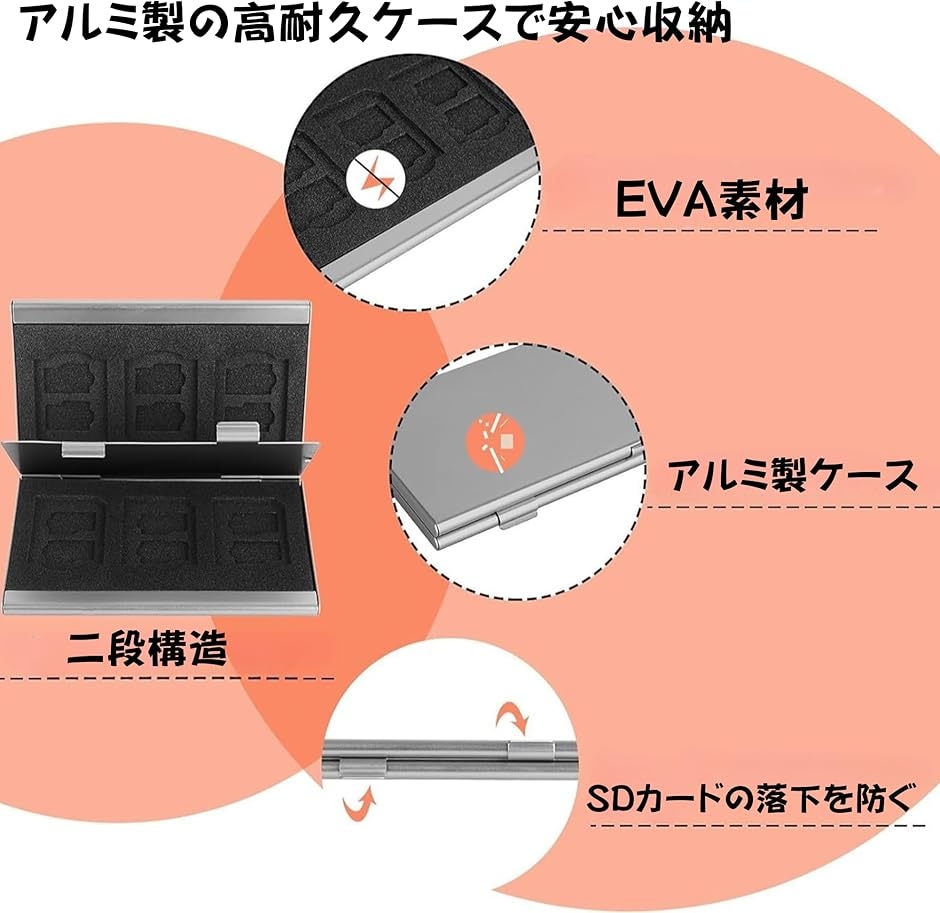 「安心の防塵・耐衝撃」このアルミ製メモリカードケースは、SDカードやMicroSDカードをしっかりと保護します。
