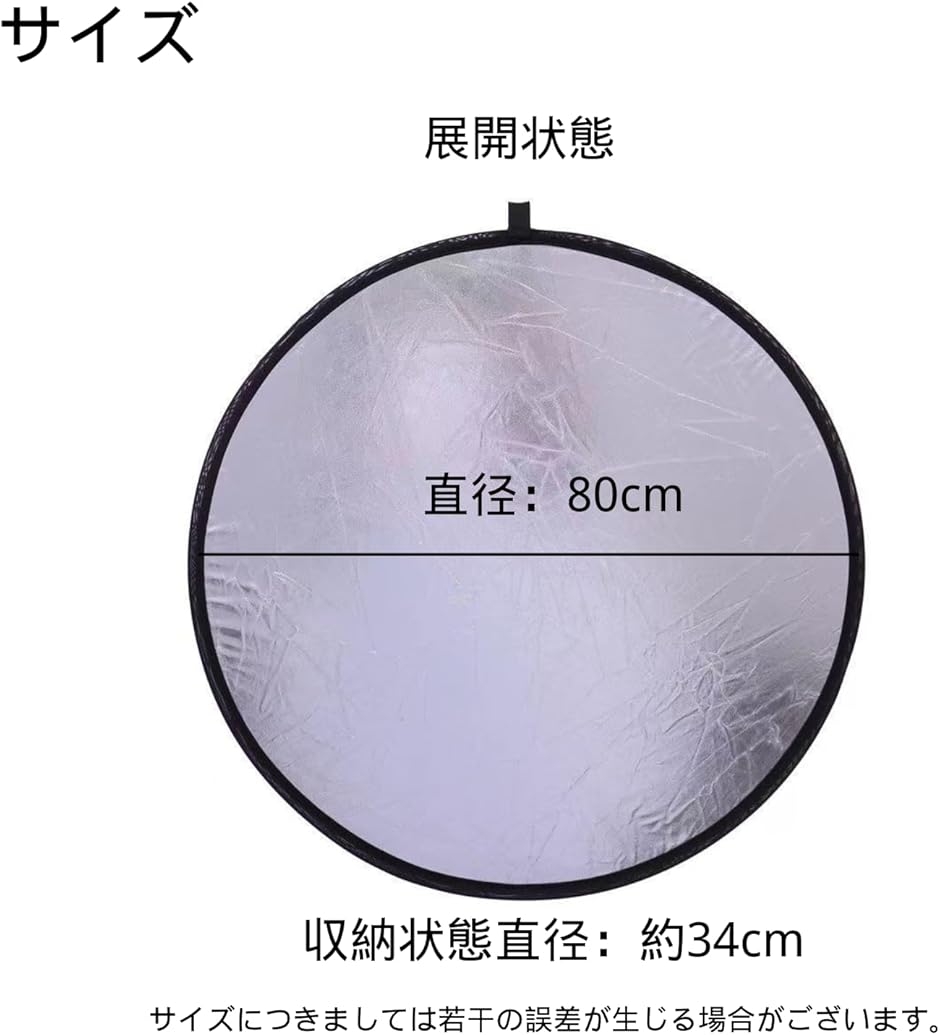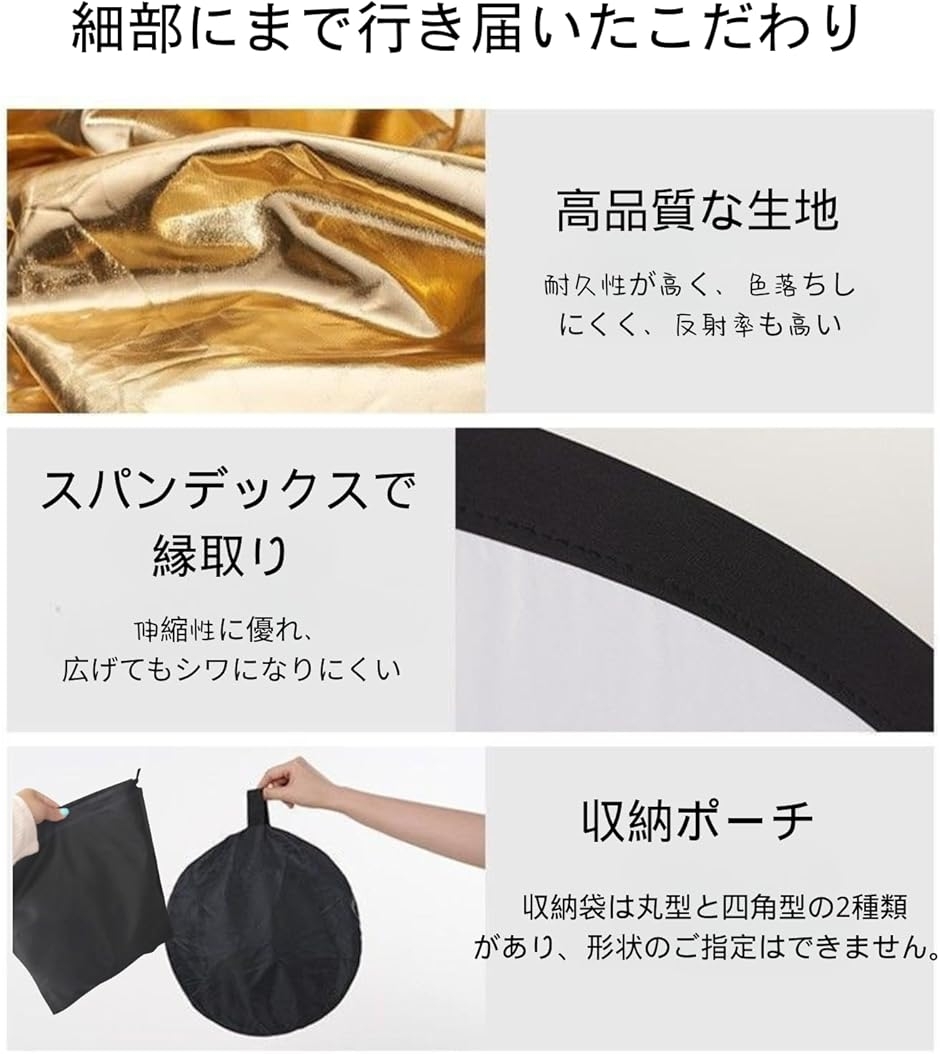 - バリエーションコード : 2bup0sw5ok商品コード2bup0vf1nk商品名撮影用 レフ板 丸型 折りたたみ 収納バックブランドNASSIAカラーシルバーサイズ等80cm「プロフェッショナルな光の調整」NASSIAの丸レフ板は、撮影現場での光の反射を最適化し、被写体をより美しく引き立てます。銀面は強い光を反射し、シャープな影を作り出すのに最適です。白面は柔らかい光を提供し、自然な仕上がりを実現します。「持ち運びに便利なデザイン」直径80cmのコンパクトサイズで、折りたたみ可能な設計により、どこへでも簡単に持ち運べます。撮影現場でのセッティングがスムーズになり、時間を有効に活用できます。「耐久性のある素材」高品質な素材を使用しており、長時間の使用にも耐えられる頑丈な作りです。頻繁な使用でも形状を保ち、安定したパフォーマンスを提供します。「多用途な使用シーン」ポートレート撮影から商品撮影まで、さまざまなシーンで活躍します。プロのフォトグラファーからアマチュアまで、幅広いユーザーに対応したアイテムです。「簡単なセットアップ」初心者でも簡単に使用できる設計で、特別な技術や知識がなくてもすぐに撮影を始められます。効率的な撮影をサポートし、クリエイティブな表現を可能にします。*注意ください* ・写真の写り方により、実際の商品と異なって見える場合がございます。・サイズにつきましては若干の誤差が生じる場合がございます。・生産時期により、商品のデザインが若干異なる場合がございます。上記予めご了承の上お買い求めくださいませ。※ 他ネットショップでも併売しているため、ご注文後に在庫切れとなる場合があります。予めご了承ください。※ 品薄または希少等の理由により、参考価格よりも高い価格で販売されている場合があります。ご注文の際には必ず販売価格をご確認ください。※ 沖縄県、離島または一部地域の場合、別途送料の負担をお願いする場合があります。予めご了承ください。※ お使いのモニタにより写真の色が実際の商品の色と異なる場合や、イメージに差異が生じることがあります。予めご了承ください。※ 商品の詳細(カラー・数量・サイズ 等)については、ページ内の商品説明をご確認のうえ、ご注文ください。※ モバイル版・スマホ版ページでは、お使いの端末によっては一部の情報が表示されないことがあります。すべての記載情報をご確認するには、PC版ページをご覧ください。*直径:約80cm収納する状態直径:約34cm*カラー:シルバー ゴールド**サイズと重量に多少の誤差がある場合がございますので、ご了承ください。*商品はモニターによって色合い等、実物と多少差異がある場合があります。