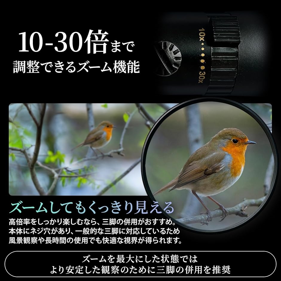 「10-30倍ズーム&高性能レンズ搭載」調整可能な10〜30倍ズームとBAK4ポロプリズム、FMCマルチコーティングレンズを採用。
