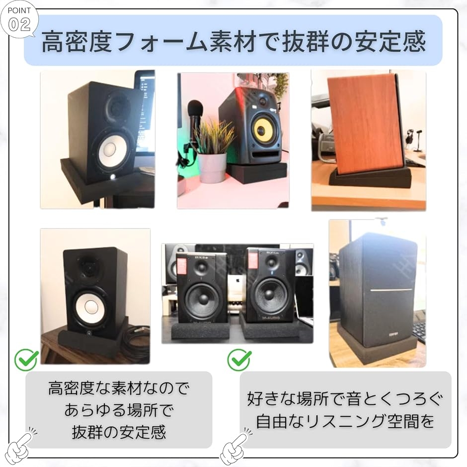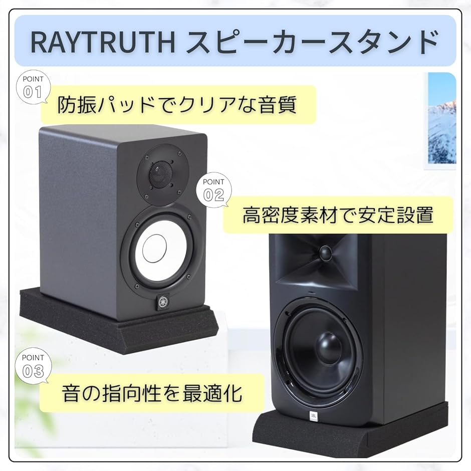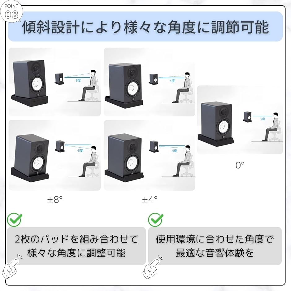 角度による音響改善と振動抑制を両立し、作業用・モニター用スピーカーの性能を最大限に引き出します。