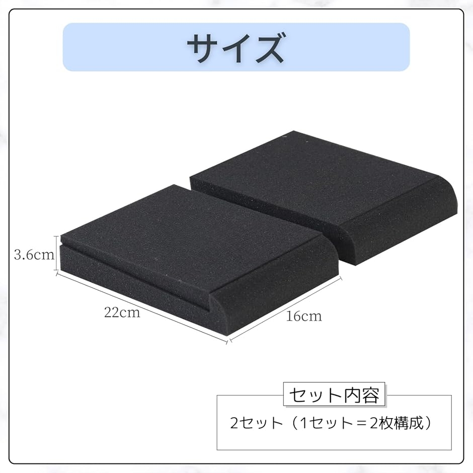 - 商品コード2buit9kw5v商品名スピーカースタンド 卓上 スピーカー台 吸音 インシュレーター 防振パッド 振動吸収マット 黒 2枚組x2セットブランドRAYTRUTHカラーブラック「音響のクリアさを引き出す防振パッド」スピーカーの下に設置することで、不要な振動を吸収し、共振による音質の乱れを抑制。音の輪郭がより鮮明になり、デスクトップ環境でも本格的な音響体験をサポートします。「高密度フォーム素材で安定設置」高密度ウレタンフォームを採用し、耐久性・防滑性に優れた構造。しっかりとしたクッション性により、機材の重さにも強く、長期間使用しても型崩れしにくい設計です。「傾斜設計で音の指向性を最適化」前方に向かって緩やかな傾斜を持たせた設計で、音の到達方向を調整可能。角度による音響改善と振動抑制を両立し、作業用・モニター用スピーカーの性能を最大限に引き出します。「商品仕様」サイズ約22cmx16cmx3.6cm、傾斜設計。1セットに2枚入りで、スピーカー左右に対応可能。(*本製品は過剰な包装を避け、環境への負担を抑えるミニマルパッケージでお届けします。持続可能な社会の実現に向けた、小さな一歩を形にしています)※ 他ネットショップでも併売しているため、ご注文後に在庫切れとなる場合があります。予めご了承ください。※ 品薄または希少等の理由により、参考価格よりも高い価格で販売されている場合があります。ご注文の際には必ず販売価格をご確認ください。※ 沖縄県、離島または一部地域の場合、別途送料の負担をお願いする場合があります。予めご了承ください。※ お使いのモニタにより写真の色が実際の商品の色と異なる場合や、イメージに差異が生じることがあります。予めご了承ください。※ 商品の詳細(カラー・数量・サイズ 等)については、ページ内の商品説明をご確認のうえ、ご注文ください。※ モバイル版・スマホ版ページでは、お使いの端末によっては一部の情報が表示されないことがあります。すべての記載情報をご確認するには、PC版ページをご覧ください。