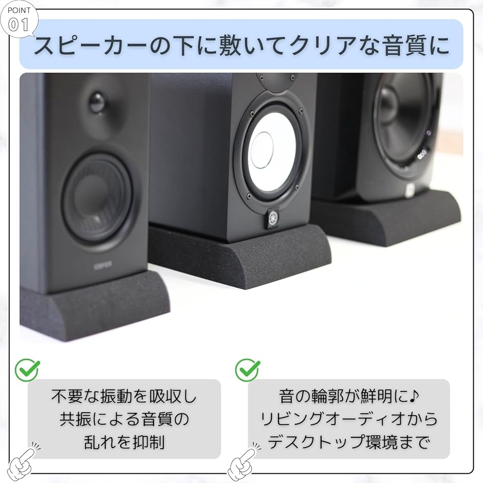 「音響のクリアさを引き出す防振パッド」スピーカーの下に設置することで、不要な振動を吸収し、共振による音質の乱れを抑制。