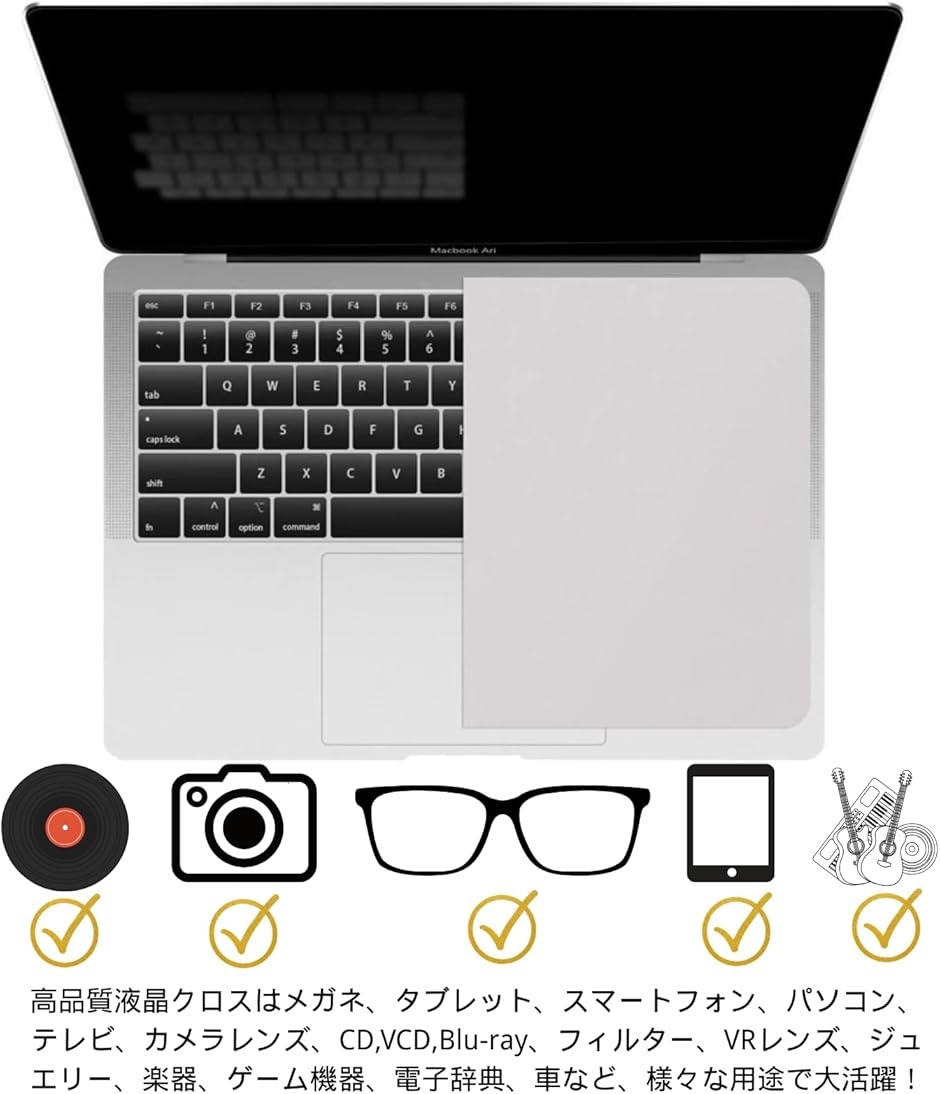 クリーニングクロスは超極細繊維(マイクロファイバー)で作られており、静電気抑制で、指紋や皮脂などを軽く拭き取れ、汚れを強力除去。抜群で柔らかい生地で液晶画面にキズを付けられないし、クロスを挟んたままで、フタを浮く感がありません。
