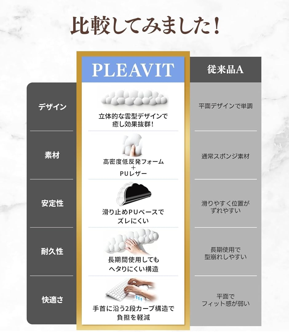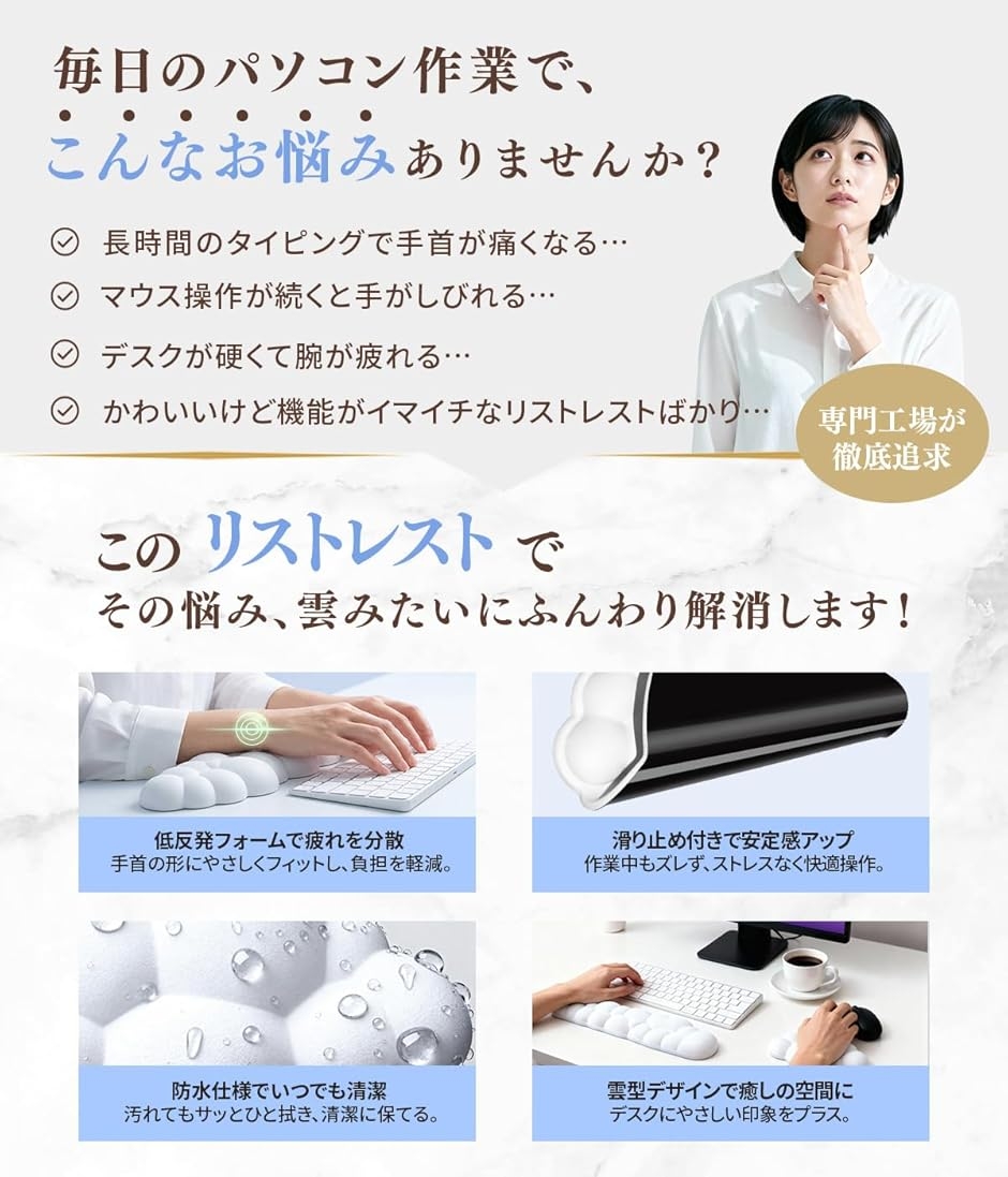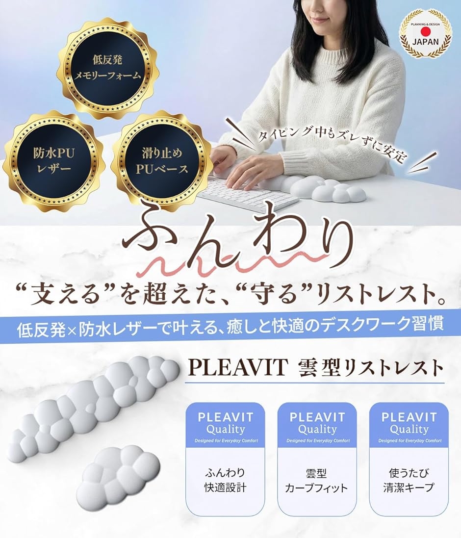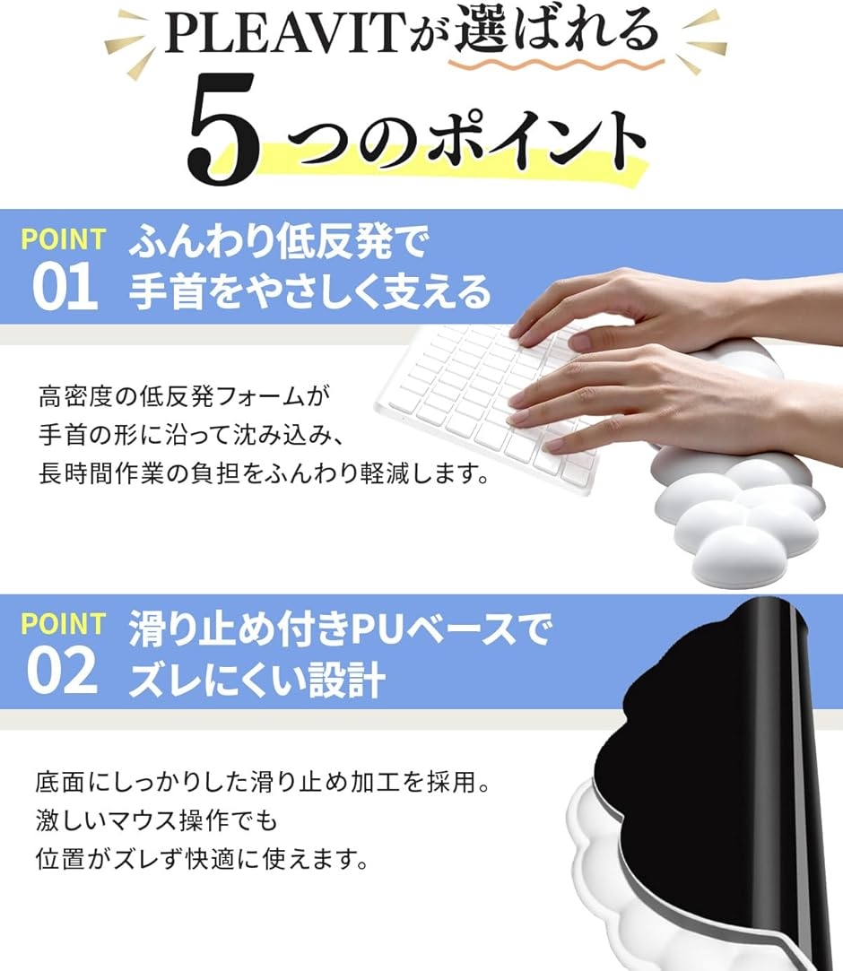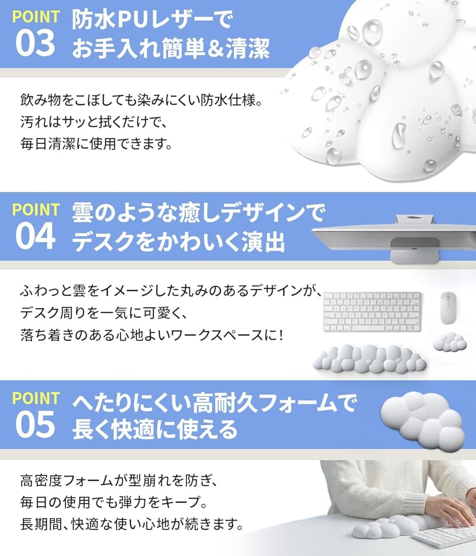 - バリエーションコード : 2brf3kr956商品コード2brf388h89商品名リストレスト ホワイト フルサイズブランドPLEAVITカラーホワイトサイズ等フルサイズ セット「ふんわり低反発で手首をサポート」 高密度メモリーフォームが手首の重みに合わせて沈み込み、圧力をやさしく分散。疲れを軽減し、作業に集中できます。「さらさらPUレザーで快適」 肌触りの良いPUレザーを採用。蒸れにくく、サラッとした感触で季節を問わず快適に使用できます。「防水仕様でお手入れ簡単」 飲み物をこぼしても安心の防水設計。汚れたら柔らかい布で軽く拭くだけで、清潔な状態をキープ。「滑り止め付きでズレにくい」 底面に滑り止め加工を施し、激しいマウス操作中でもしっかり安定。ストレスのない操作性を実現しました。「雲のような癒しデザイン」 デスクに置くだけで気分がふわっと和む雲型フォルム。作業空間を明るく、心まで軽やかに整えます。※ 他ネットショップでも併売しているため、ご注文後に在庫切れとなる場合があります。予めご了承ください。※ 品薄または希少等の理由により、参考価格よりも高い価格で販売されている場合があります。ご注文の際には必ず販売価格をご確認ください。※ 沖縄県、離島または一部地域の場合、別途送料の負担をお願いする場合があります。予めご了承ください。※ お使いのモニタにより写真の色が実際の商品の色と異なる場合や、イメージに差異が生じることがあります。予めご了承ください。※ 商品の詳細(カラー・数量・サイズ 等)については、ページ内の商品説明をご確認のうえ、ご注文ください。※ モバイル版・スマホ版ページでは、お使いの端末によっては一部の情報が表示されないことがあります。すべての記載情報をご確認するには、PC版ページをご覧ください。「長時間のデスクワークでも、手首をやさしく支える雲型リストレスト」キーボード用とマウス用の2点セットで、ふんわりとした雲のような形が手首のカーブに自然にフィットします。表面はさらりとしたPUレザー素材で、中には高密度の低反発フォームを採用。手首をそっと包み込み、長時間の作業による疲れや痛みを軽減します。底面には滑り止め加工を施し、操作中もズレにくく安定。防水仕様だから、汚れてもサッと拭くだけで清潔に保てます。見た目にも癒される雲デザインで、オフィスでも自宅でも気分がふんわり和らぎます。「デスクに座るのが楽しみになる」そんな快適空間を演出します。