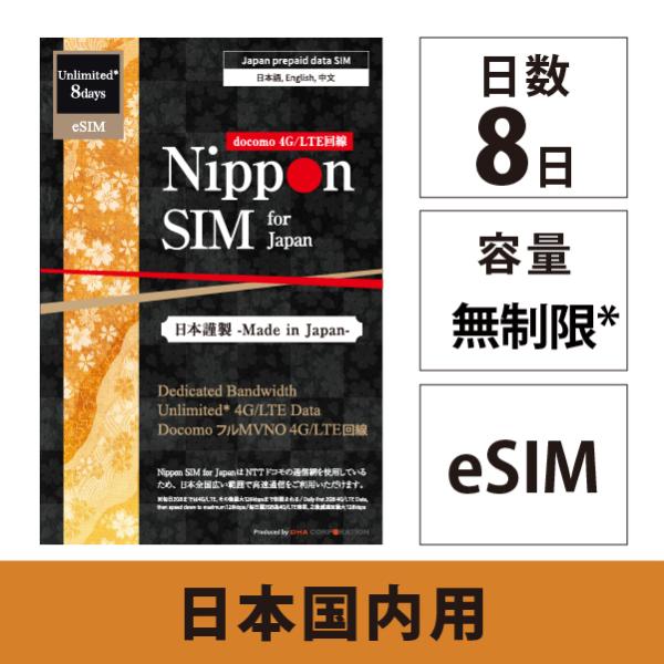 - Nippon SIM for Japan eSIM 無制限版 8日 日本国内用 ドコモ回線 プリペイドデータ eSIMDHA Corporation データ通信専用プリペイドeSIM 毎日2GB 8日間【eSIM端末専用】Nippon SIM for Japan 無制限版 8日 日本国内用プリペイドデータ eSIM (ドコモ回線) 事務手続一切不要・QRコード同梱・簡単設定/即利用OK。来日された方で1週間の日本滞在に最適です。【個人認証不要、契約不要、事務手数料不要】●こちらの商品は【eSIM端末専用】となります。SIMカードは入っておりません。代わりにQRコードが入っておりますので、そちらを読み込んで設定を行なってください。●NTTドコモの通信網で広範囲の高速通信!※ご購入のLTEデータを使い切ると当日23:59まで最大128kbps。日付が変わりますと再び2GB/日が使用可能です。●【eSIM端末のみの専用プラン】 eSIM搭載 SIMフリーのiPhone / iPad / スマホのみご利用が可能です。●使用可能端末:SIMフリー対応 iPhone / iPad / Android スマホでご利用が可能です。●対応周波数帯:4G/LTE: Band 1 (2.1GHz) / Band 3 (1.8GHz) / Band 19 (800MHz) / Band 21 (1.5GHz) / Band 28 (700MHz) / Band 42 (3.5GHz)●eSIM QRコード/注意書き/多言語マニュアル(日本語・英語・中国語・韓国語・タイ語)