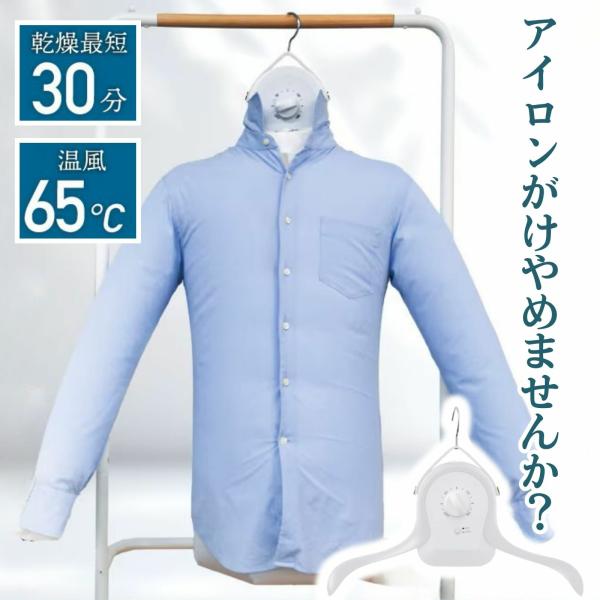 - 【商品解説】●面倒なアイロンがけはもう不要!?ハンガー型でコンパクトな、シワが伸びる乾燥機面倒なアイロンがけ、もうやめませんか。乾燥もシワ伸ばしもこれ1台!毎日の家事がちょっと楽になるハンガー型の乾燥機「アイロンいら〜ず」が、ホワイト/ブラックの2色になって新登場。洗い上がりのシャツなどを最短30分で乾燥し、同時にシワを伸ばします。●アイロンいらずでシワが伸びるアイロンいらずでシワが伸びる乾燥機「アイロンいら〜ず」は、本体から約65℃の熱風を出して乾かすから、最短30分で乾燥が完了しちゃう!さらにパリッとシワを伸ばして乾燥させるので、アイロン不要なのです。サイズは調整紐や襟元のファスナーで調整できるのでS〜LLまで対応可能!また、タイマー式で安心!温冷切り替えで熱に弱い素材にも使えます。●前作からの最大の進化は「超小型化」超小型になった上に「ハンガー型」で、置き場所に困らなくなりました!ラックにぶら下げっぱなしもよし、分解できるので、棚などへの収納もできます。●使用方法3STEP使用方法はとっても簡単。1.洗濯脱水後のシャツをエアバッグに着せる。2.タイマーを回したらエアバッグが膨らんでいき乾燥がスタートします。3.エアバッグが膨らんだらシワを整えるのが綺麗に仕上げるポイントです!あとは乾燥が完了するまで待つだけ。●2色のカラーが登場ホワイトとブラックの2色が登場。マットな質感と統一感のあるデザインで、インテリアに馴染みます。【スペック】●型式:HRNCLSSWH(HRNCLSSWH)●JANコード:4580060600014本体重量:約700g消費電力:620W仕様1:●タイマー 15〜180分 ●耐荷重 約5kg ●安全装置 ヒューズ(10A)、温度ヒューズ(121℃)、サーモスタット(85℃)、転倒時安全スイッチ ●材質 本体:ABS、ナイロン、スチール、PVC アーム:ABS エアバッグ:ポリエステル ●ケーブル長 約180cm ●セット内容 本体、アーム(左右各1本)、エアバッグ、日本語取扱説明書この商品は宅配便でお届けする商品です出荷可能日から最短日時でお届けします。※出荷完了次第メールをお送りします。配送サービス提供エリアを調べることができます「エリア検索」をクリックして、表示された画面にお届け先の郵便番号7桁を入力してください。ご購入可能エリア検索お買い上げ合計3,980円以上で送料無料となります。※3,980円未満の場合は、一律550円(税込)となります。●出荷可能日から最短日時でお届けします。(日時指定は出来ません。) ※お届け時に不在だった場合は、「ご不在連絡票」が投函されます。 「ご不在連絡票」に記載された宅配業者の連絡先へ、再配達のご依頼をお願いいたします。●お届けは玄関先までとなります。●宅配便でお届けする商品をご購入の場合、不用品リサイクル回収はお受けしておりません。●全て揃い次第の出荷となりますので、2種類以上、または2個以上でのご注文の場合、出荷が遅れる場合があります。詳細はこちら■商品のお届けについて商品の到着日については、出荷完了メール内のリンク(宅配業者お荷物お問い合わせサービス)にてご確認ください。詳しいお届け目安を確認する1度の注文で複数の配送先にお届けすることは出来ません。※注文時に「複数の送付先に送る」で2箇所以上への配送先を設定した場合、すべてキャンセルとさせていただきます。