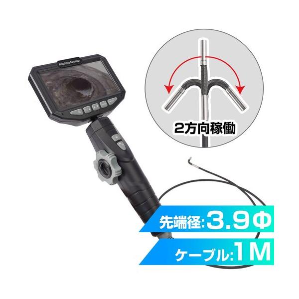 - 【商品説明】●2方向に180度先端カメラが曲がる先端可動式3.9mm工業用内視鏡●2方向に180度先端カメラが曲がる先端可動式3.9mm工業用内視鏡●モニター下にあるダイヤルを回す事で、カメラを曲げることができる先端可動式の内視鏡です。●先端径は3.9mmで細い管などでお使い頂けます。●カメラ防水性能はIP67。●また、カメラ先端部には6灯のLEDライトを装備。●モニター画面の角度を調整が可能です。●左右2方向に稼働する先端カメラ●先端カメラ部は手元のダイヤルを回すと、左右2方向に180度曲がります。●カメラ角度をロックすることが可能。●しっかりと観察したい場所を見ることができます。●カメラ径3.9mm LEDライト6灯●先端カメラ径3.9mm。●LEDライトを6灯搭載し、3段階で明るさを調整することができます。●ケーブル部およびカメラ部は、IP67防水機能搭載のため水気の多い場所でも使用可能です。●角度を変えられる5インチカラーディスプレイ●5インチのカラーモニターは、前後、左右で角度を変えることができます。●バッテリー内蔵USB充電式●本製品はバッテリー内蔵で、USB充電式となっています。●約6〜7時間の充電で、約3〜3.5時間連続で使用することができます。●サイズ・重量(本体) : 幅135×奥行き50×高さ335mm、約420g●サイズ・重量(ケース) : 幅450×奥行き285×高さ110mm、約2.2kg●カメラ先端径 : 3.9mm●カメラケーブル長 : 1m(非形状記憶型)●ピントが合う距離 : 20〜50mm●ケーブル回転角 : 左右各180度●視野角 : 80度●光源 : 白色LED6灯(3段階明るさ調整)●防水性 : IP67(カメラおよびケーブル部)●表示部 : 5インチカラーディスプレイ●電源 : 内蔵バッテリー●バッテリー充電 : USB‐AC アダプター(5V 2.0A 以上推奨)●バッテリー : リチウムポリマーバッテリー 3.7V 5000mAh●連続駆動時間 : 約3〜3.5時間●充電時間 : 約6〜7時間●解像度 : 静止画…1280×720/動画…1280×720 25fps●対応SDカード : microSDカード(〜32GB Class10推奨)●動作温度 : -10℃〜60℃●カメラ動作温度 : -10℃〜60℃●USBケーブル長 : 約950mm●セット内容 : 本体、microSD カード (8GB)、USBケーブル、USB-ACアダプター、クリーンクロス、日本語取扱説明書●保証期間 : 購入日より12ケ月●注意事項●※記載されている物以外は付属いたしません。●※落としたり強い衝撃を与えないでください。●※分解しないでください。●※本製品をご利用において生じる物品の破損は、保証の対象外となります。●※異常を感じたらただちにご使用をやめ、弊社カスタマーサポートまでご連絡ください。●※ご使用中においてのお客様の過失による故障、破損、改造等はサポート保証の対象外となります。●※正しく使用されない場合に生じた事故等について弊社での責任は負いかねます。●※製品仕様は改善のため予告なく変更する場合があり、そのため説明書記載の内容と異なる場合があります。。類似商品はこちらサンコーレアモノショップ SKDSC28T12836,376円サンコーレアモノショップ SKDSC28T22929,623円直送・代引不可 先端可動式工業用内視鏡 ビデオ272,739円MDRCTBR33 先端360度ジョイスティッ377,762円サンコーレアモノショップ HAIKANCAM6885,272円TASCO タスコ TA418MB-1M 1方158,810円サンコーレアモノショップ HANDOOP3 配6,443円サンコーレアモノショップ LCNRCP1M ポ18,800円TASCO タスコ TA418MF-1.5MS602,285円TASCO タスコ TA418AC-1M 先端128,096円直送・代引不可 工業用内視鏡 ビデオフレックス127,069円直送・代引不可 工業用内視鏡 ビデオフレックス101,017円