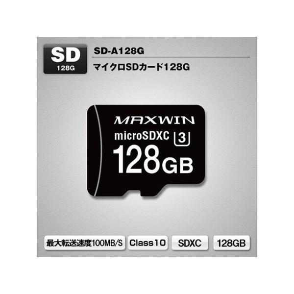 - 商品説明 ・マックスウィンの128GB microSDXCカード、SD-A128Gです。 ・ドライブレコーダーに最適な各種規格を採用したUHSスピードクラス3、V30ビデオスピードクラス30です。 ・安心のメーカー保証1年付きです。(※ドライブレコーダーにご使用の場合のみ) 仕様 容量:128GB 規格:SDXC インターフェース:SDインターフェース規格準拠 UHS-I SDスピードクラス:クラス10 UHSスピードクラス:クラス3 ビデオスピードクラス:V30 最大転送速度:100MB/s MAXWIN SDカード LINEUP microSDXCカード 256GBSD-A256G microSDXCカード 128GBSD-A128G microSDXCカード 64GBSD-A64G microSDHCカード 32GBSD-A32G※画像はイメージです。