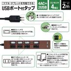 粗い木目調 延長コード 2m 電源タップ usb付き 雷ガード USB 充電ポート付 電源タップ 2ポート合計2.4A出力・コンセント4口・2m USB 延長コード