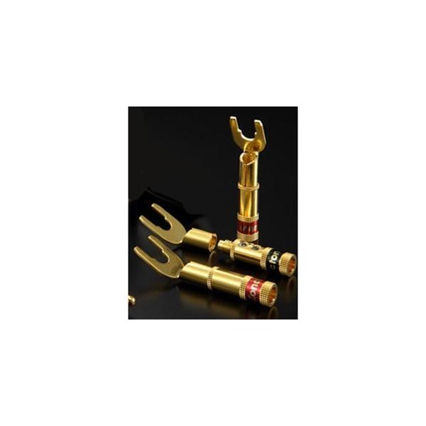 - ■仕様 ○ケーブルと端子のコンタクトをより確実にするゾノトーンオリジナルのユニバーサルタイプ ○ヴィンテージ・ピン、Yラグとバナナ・プラグが簡単に交換できる3ウェイ・プラグで、旧型端子から現用各種端子まで幅広く対応 ○ハンダ不要。2本の大型六角ネジを採用。直接芯線を船底部まで食い込ませる強固な圧縮固定方式 ○長期の使用でも狂いや劣化が生じにくい堅牢な精密設計 ○汎用タイプの装飾用とは違う高純度なロジウム・メッキ及び純金メッキを採用 ○ヴィンテージ・ピン、Yラグ、バナナ・プラグが各4個ずつ入ったセットを用意 ○ケーブル最大径5.5 mmφまで使用可能使いやすさ、音質、信頼性を徹底的に追及。特太5.5mmφ対応先端3タイプ着脱式ユニバーサル・スピーカーケーブルコネクターです。 ※Yラグ、金メッキ仕様 4本組