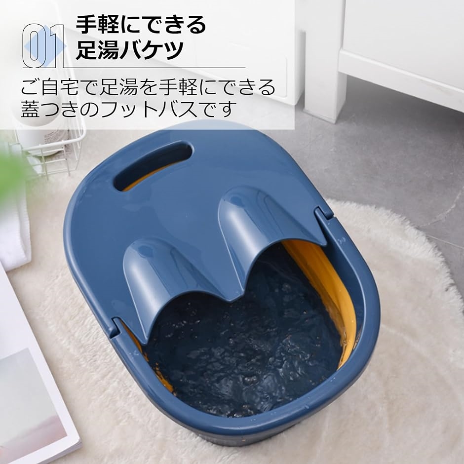 - 「手軽にできる足湯バケツ」ご自宅で足湯を手軽にできる蓋つきのフットバスです。蓋がついていることで保温効果も高いです。「コンパクトに収納できます」折りたたむことができるのでコンパクトサイズで収納できます。高さが約8cmなのですき間に入れやすいです。「持ち運びも簡単」取っ手がついているので持ち運びも簡単です。ご自宅だけでなくアウトドア等でも使えます。「オリジナルパッケージ付」Asdaysブランドより、オリジナルパッケージで迅速にお客様の元へお届けいたします。商標登録第6473556号。※ 他ネットショップでも併売しているため、ご注文後に在庫切れとなる場合があります。予めご了承ください。※ 品薄または希少等の理由により、参考価格よりも高い価格で販売されている場合があります。ご注文の際には必ず販売価格をご確認ください。※ 沖縄県、離島または一部地域の場合、別途送料の負担をお願いする場合があります。予めご了承ください。※ お使いのモニタにより写真の色が実際の商品の色と異なる場合や、イメージに差異が生じることがあります。予めご了承ください。※ 商品の詳細(カラー・数量・サイズ 等)については、ページ内の商品説明をご確認のうえ、ご注文ください。※ モバイル版・スマホ版ページでは、お使いの端末によっては一部の情報が表示されないことがあります。すべての記載情報をご確認するには、PC版ページをご覧ください。「商品詳細」足湯バケツ サイズ:幅30x21x高さ17cm(折り畳み時:高さ8cm)「材質」プラスチック「カラー」イエローブルー