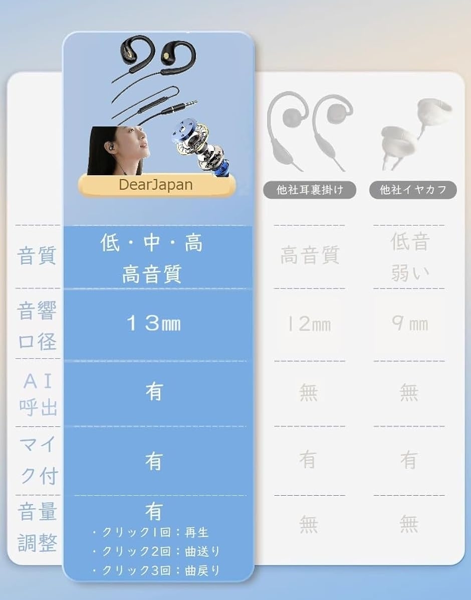 「耳塞がない・オープンイヤー・耳掛け有線イヤホン」このイヤホンは耳の中に入れない、耳に掛けたまま使えるオープンイヤー型により、長時間の装着による外耳道への負担がなく、耳が痛くならないです。