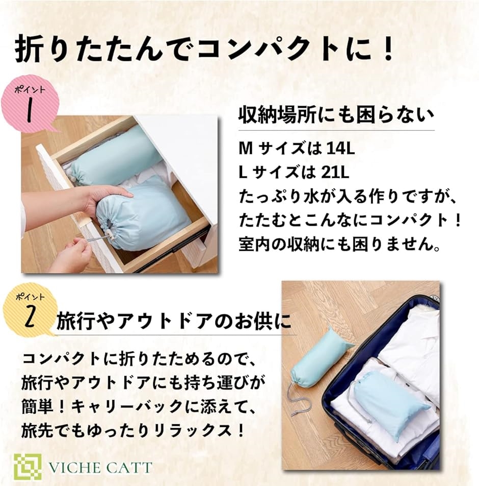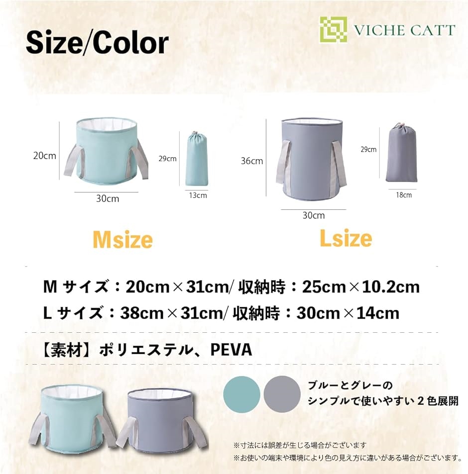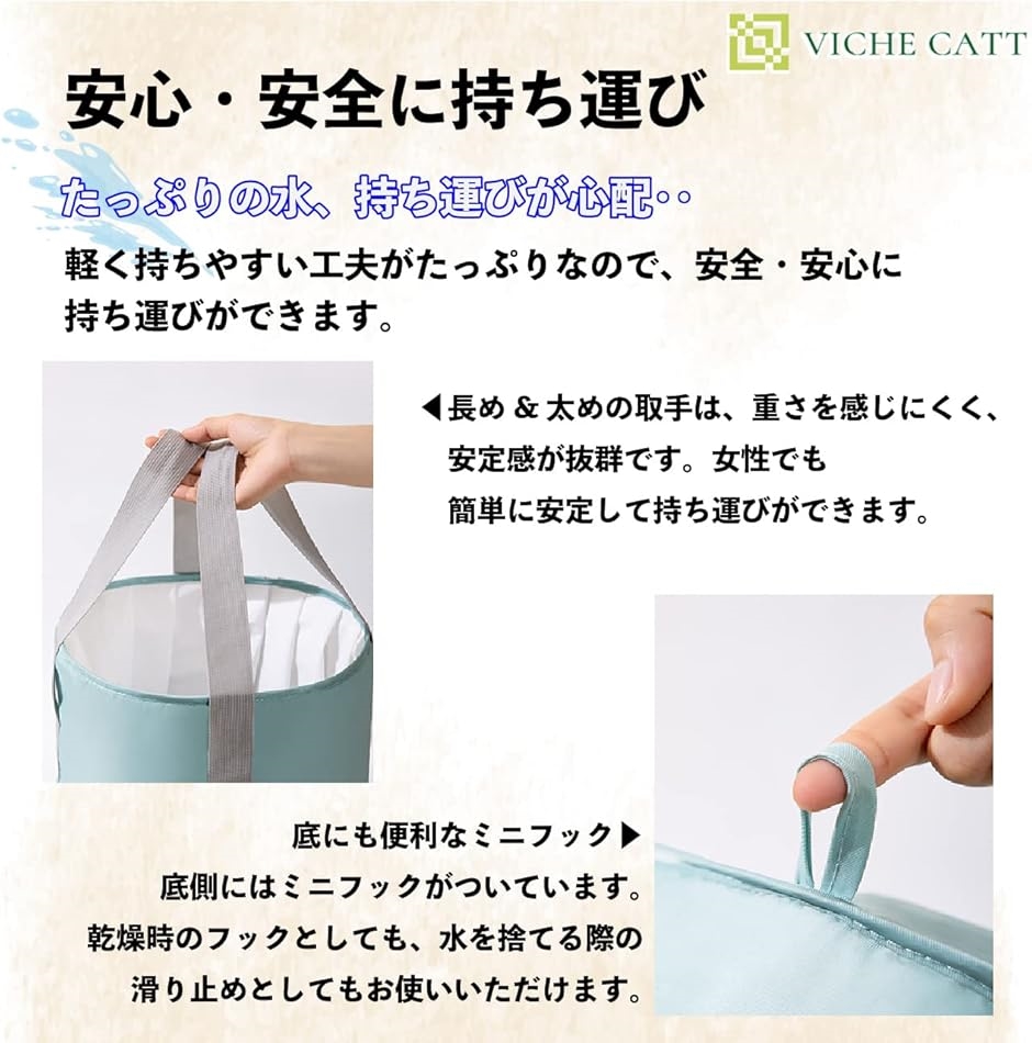 - バリエーションコード : 2bjy1vclhl商品コード2b2cp4x3ou商品名折りたたみバケツ 足湯 バケツ 保温 フットバス 折り畳み アウトドアバケツ 多用途 収納袋付き L ブルーブランドVICHE CATTカラーブルーサイズ等Largeリラックスタイムにぴったりの足湯バケツです。寒い時期、冷え性の方には足先を温めるフットバスとして、スポーツの後にはアイシングバケツとして、洗濯物のつけ置きなど、幅広く使える万能アイテム。コンパクトに折りたためるため、収納場所にも困りません。いざとなれば避難道具の1つとしても使える。折りたたみ式のコンパクトなバケツはいかがでしょうか。持ち運びしやすい取手付き&折りたたみ式。柔らかい持ち手は手触りがよく、たっぷりのお湯をいれても、女性1人で簡単・安全に持ち運び・お湯捨てができます。また、フットバスやアイシングのみならず、休日は、洗車やガーデニング、BBQなど、ちょっとお湯をためておきたい時に大活躍。きれいな水をこぼさずずっと保ち、ストレスない快適な生活を実現します。また、災害のときには、顔や足を洗うための洗面器としても利用可能。その利用方法は無限大です。たっぷりお湯が入る大容量バケツにもかかわらず、折りたたむととってもコンパクト。乾かす時は、バケツの底のフックに吊るして干すことができるので、室内でも邪魔になることはありません。また、バケツを裏返すこともでき、清潔を保ちます。完全に乾いたら、小さく折りたたんで、ケースに入れ収納場所へ。軽量&コンパクトサイズのため置き場所に困ることはありません。すぐ使いたい時にも煩わしくない、簡単な組み立てで、日常に馴染みます。人間は、足を温め血管を拡張させることで、リラックス効果があると言われています。とくに、足首やふくらはぎには太く大きな血管があります。それらを重点的に温めることで、リラックスが促進され、全身がポカポカ温まってきます。また、お子様の部活やスポーツ後のアイスバケツとしても幅広く利用されています。アイシングを行うことで、筋肉の疲労が急速に取れると言われており、手軽に使えるアイシングバケツは活用できること間違いありません。この他にも、水やお湯をためておきたい洗車時やBBQシーンでの利用、室内では洗濯のつけ置きやお掃除時のバケツとして等、幅広くご活用いただけます。サイズは、用途に応じて選べる2種類を用意しました。Mサイズは足首が浸かる程度の大きさで、コンパクトですがしっかりと足を温めます。Lサイズは深めのつくりで、ふくらはぎまでしっかりと温めます。ご用意カラーはブルー&グレー。性別や年齢問わず使っていただけるシンプルな色味です。「詳細情報」 *カラー:ブルー/グレー *サイズ:M(高さ20cmx直径31cm/袋:縦29cmx横15cm)、L(高さ36cmx直径31cm/袋:縦29cmx横20cm) *重さ:M 205g/L 215g *水量:M 約14L、L 約21L※ 他ネットショップでも併売しているため、ご注文後に在庫切れとなる場合があります。予めご了承ください。※ 品薄または希少等の理由により、参考価格よりも高い価格で販売されている場合があります。ご注文の際には必ず販売価格をご確認ください。※ 沖縄県、離島または一部地域の場合、別途送料の負担をお願いする場合があります。予めご了承ください。※ お使いのモニタにより写真の色が実際の商品の色と異なる場合や、イメージに差異が生じることがあります。予めご了承ください。※ 商品の詳細(カラー・数量・サイズ 等)については、ページ内の商品説明をご確認のうえ、ご注文ください。※ モバイル版・スマホ版ページでは、お使いの端末によっては一部の情報が表示されないことがあります。すべての記載情報をご確認するには、PC版ページをご覧ください。リラックスタイムにぴったりの足湯バケツです。寒い時期、冷え性の方には足先を温めるフットバスとして、スポーツの後にはアイシングバケツとして、洗濯物のつけ置きなど、幅広く使える万能アイテム。コンパクトに折りたためるため、収納場所にも困りません。いざとなれば避難道具の1つとしても使える。折りたたみ式のコンパクトなバケツはいかがでしょうか。持ち運びしやすい取手付き&折りたたみ式。柔らかい持ち手は手触りがよく、たっぷりのお湯をいれても、女性1人で簡単・安全に持ち運び・お湯捨てができます。また、フットバスやアイシングのみならず、休日は、洗車やガーデニング、BBQなど、ちょっとお湯をためておきたい時に大活躍。きれいな水をこぼさずずっと保ち、ストレスない快適な生活を実現します。また、災害のときには、顔や足を洗うための洗面器としても利用可能。その利用方法は無限大です。たっぷりお湯が入る大容量バケツにもかかわらず、折りたたむととってもコンパクト。乾かす時は、バケツの底のフックに吊るして干すことができるので、室内でも邪魔になることはありません。また、バケツを裏返すこともでき、清潔を保ちます。完全に乾いたら、小