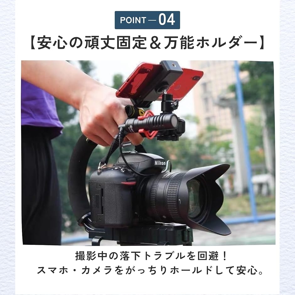 「安心の頑丈固定&ホルダー」撮影中の落下トラブルを回避。スマホ・カメラをがっちりホールドして安心。 - 楽天での商品説明(まばし商店)