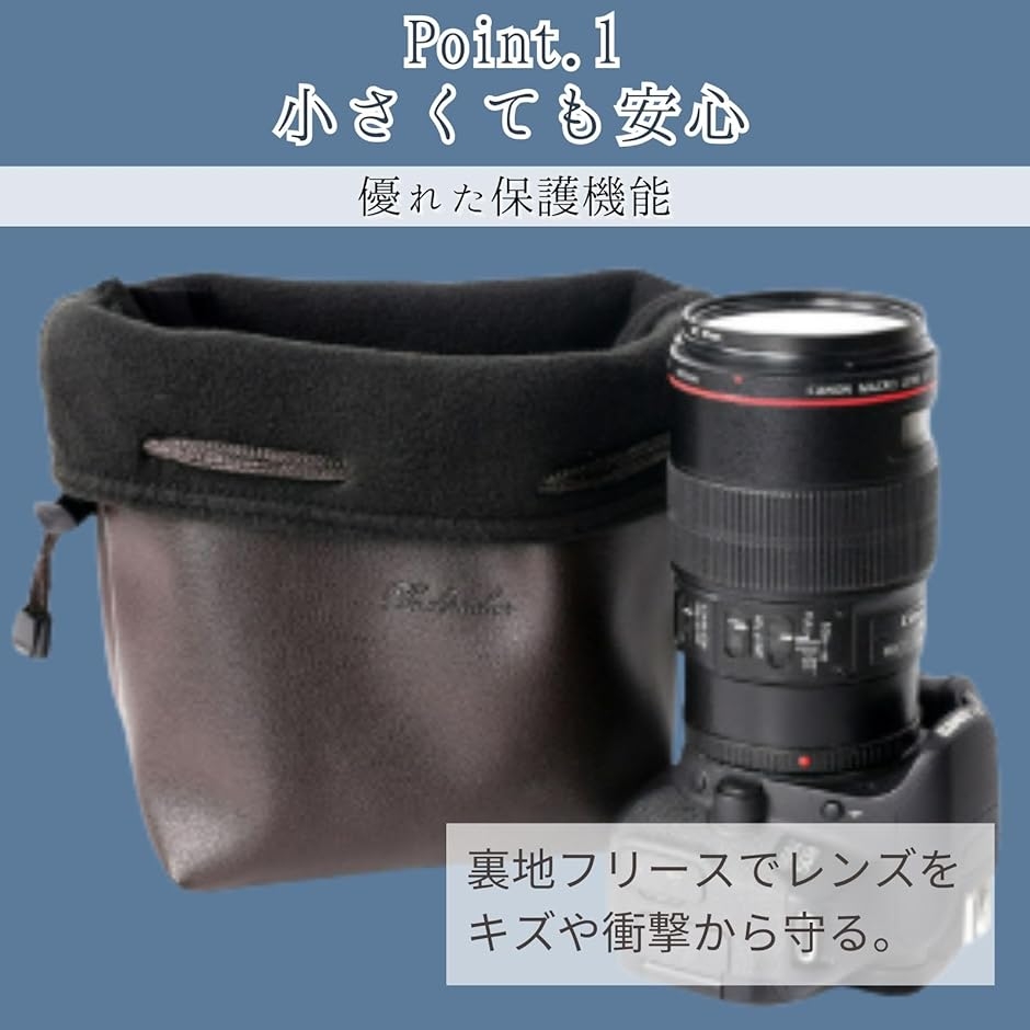「優れた保護機能」 外側の丈夫な皮革素材と、内側のフリース素材が、カメラやレンズをキズ、ホコリ、衝撃からしっかりと保護します。