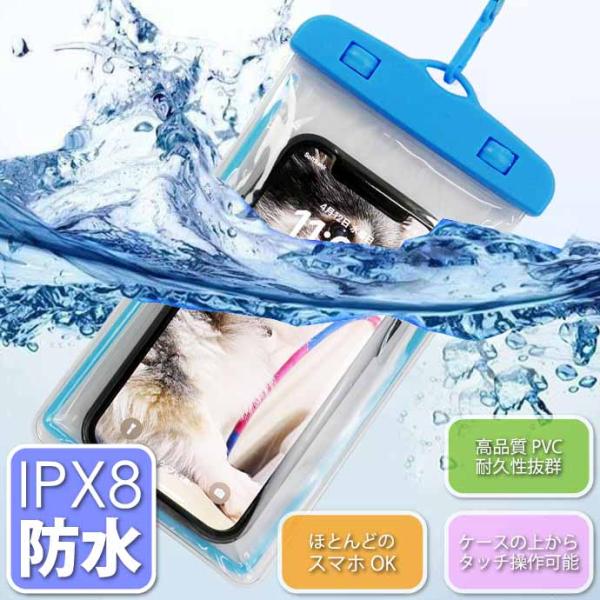スマホ 防水ケース ブルー IPX8防水スマートホンケース iPhone Android アンドロイド Xperia 対応 ストラップ付スマホショルダー Rk309