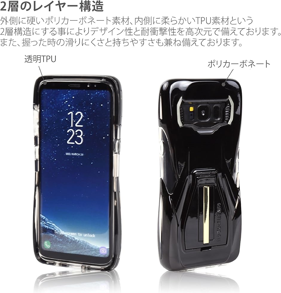 衝撃吸収:TPUとポリカーボネートの素材の違う2層のレイヤー構造を採用しておりデザイン性と耐衝撃性を高次元で備えております。