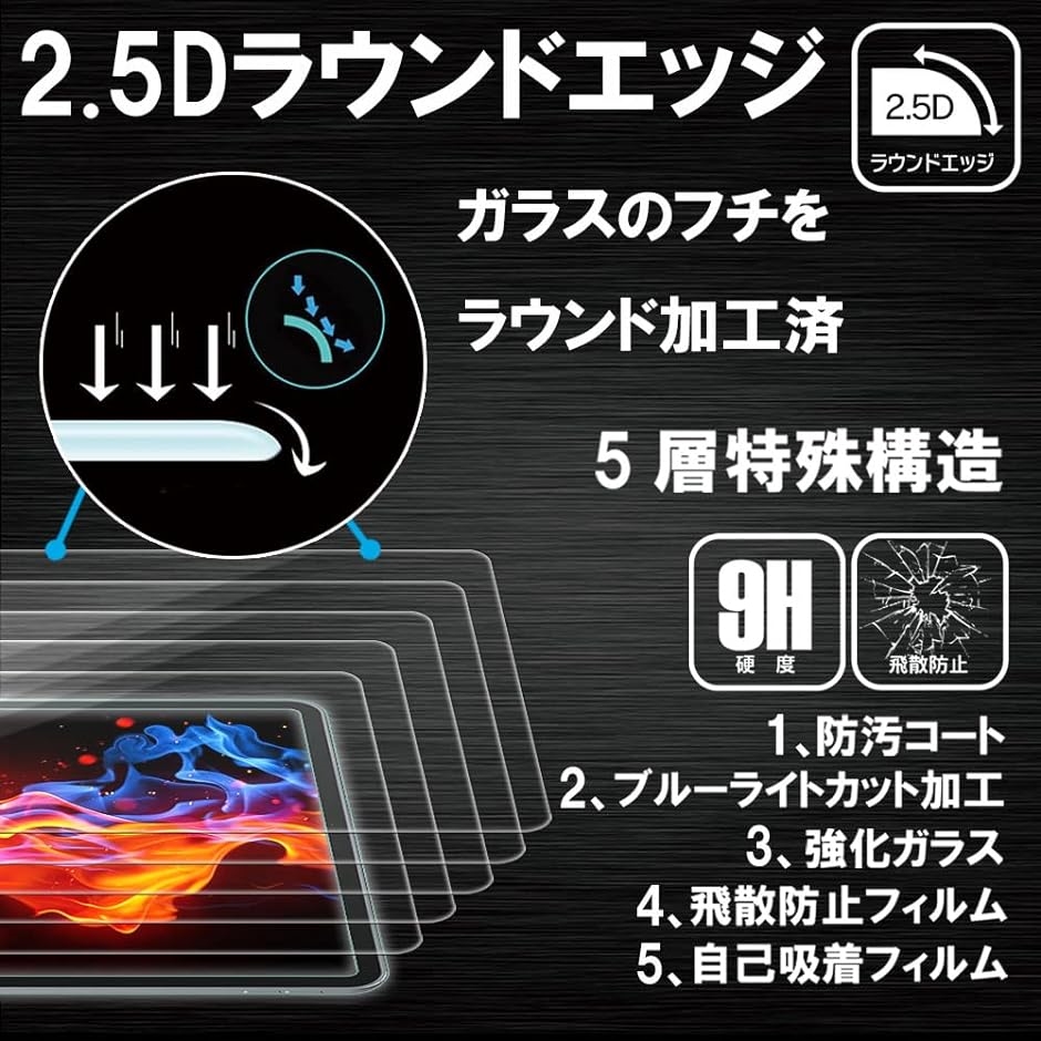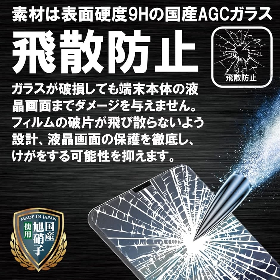5層のレイヤー加工で硬度9H、国産AGCガラスで、鋭利な傷から保護、飛散防止加工でガラスの飛び散りを防ぎ液晶破損とケガから保護。