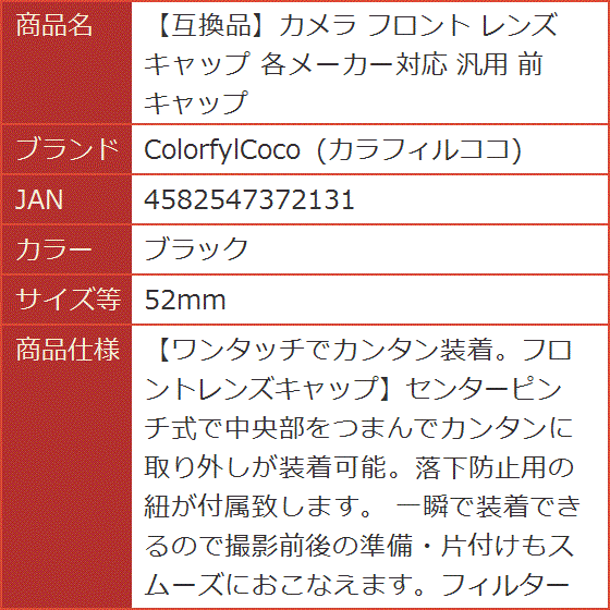 - バリエーションコード : 2b9y5nd28l商品コード2b95st99o3商品名互換品カメラ フロント レンズキャップ 各メーカー対応 汎用 前キャップブランドColorfylCoco (カラフィルココ)カラーブラックサイズ等52mm「ワンタッチでカンタン装着。フロントレンズキャップ」センターピンチ式で中央部をつまんでカンタンに取り外しが装着可能。落下防止用の紐が付属致します。一瞬で装着できるので撮影前後の準備・片付けもスムーズにおこなえます。フィルター径をご確認の上お買い求めくださいますようお願い致します。「全メーカー対応」Nikon(ニコン) 、canon(キヤノン) 、Panasonic(パナソニック)、 Sony(ソニー) 、 オリンパス 、 リコー、 富士フイルム、 ペンタックス シグマ、 タムロン、ライカ、 コニカミノルタ、など。*製品本体にメーカーのロゴはございません。「多機能な対応サイズ」大切なカメラのレンズを保護するのに最適なアクセサリー。さまざまなカメラのレンズに合うように作られています。フィッシュアイ(魚眼レンズ)、ワイド (広角)レンズ 等、一部の 凸形状のレンズには取付できない場合がございますので予めご了承くださいますようお願い致します。「高品質素材で高い耐久性」丈夫な素材でできていて、カメラのレンズをしっかり守ってくれます。傷や汚れから大切なレンズを守り長く使える安心感があります レンズキャップはメーカーロゴのないシンプルなデザイン、インナーピンチ でワンタッチ装着できます。※ 他ネットショップでも併売しているため、ご注文後に在庫切れとなる場合があります。予めご了承ください。※ 品薄または希少等の理由により、参考価格よりも高い価格で販売されている場合があります。ご注文の際には必ず販売価格をご確認ください。※ 沖縄県、離島または一部地域の場合、別途送料の負担をお願いする場合があります。予めご了承ください。※ お使いのモニタにより写真の色が実際の商品の色と異なる場合や、イメージに差異が生じることがあります。予めご了承ください。※ 商品の詳細(カラー・数量・サイズ 等)については、ページ内の商品説明をご確認のうえ、ご注文ください。※ モバイル版・スマホ版ページでは、お使いの端末によっては一部の情報が表示されないことがあります。すべての記載情報をご確認するには、PC版ページをご覧ください。