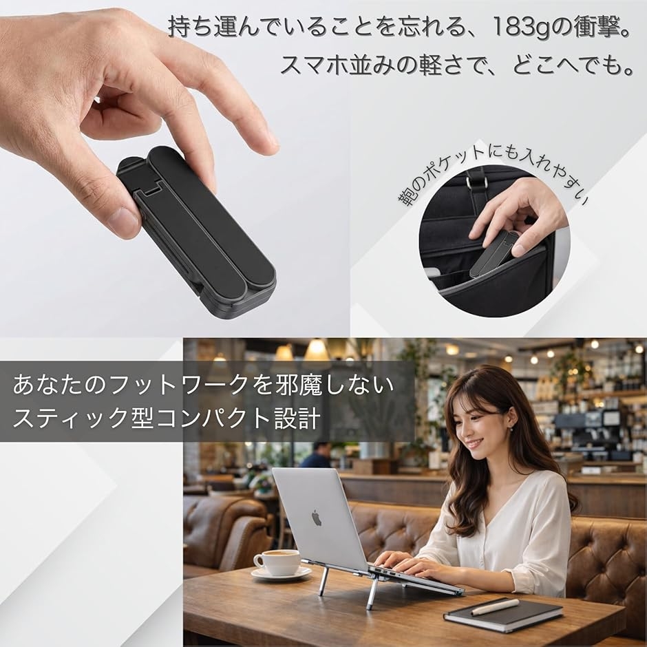 折りたたむとスティック状になり、バッグの隙間にすっぽり収まるため、外出先やカフェでの作業もストレスフリーです。