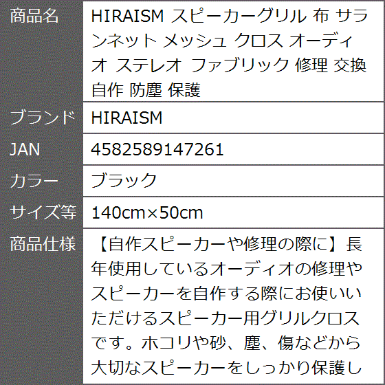 - バリエーションコード : 2b4yf08j1k商品コード2b4yf0whoh商品名スピーカーグリル 布 サランネット メッシュ クロス オーディオ ステレオ ファブリック 修理 交換 自作 防塵 保護ブランドHIRAISMカラーブラックサイズ等140cmx50cm「自作スピーカーや修理の際に」長年使用しているオーディオの修理やスピーカーを自作する際にお使いいただけるスピーカー用グリルクロスです。ホコリや砂、塵、傷などから大切なスピーカーをしっかり保護します。「音響設計もバッチリ」外観を整えたり、スピーカーを保護するだけでなく、オーディオ用に音響設計がしっかり考慮されております。不要な音域を調整し、聴きやすいクリアな音質を実現します。「しっかり丈夫な素材」大型スピーカー、ステージスピーカー、KTVボックス、ヴィンテージスピーカー等に最適。目が大きめで、中間に綿がある3重層になっているため、しっかり丈夫な仕上がりに。「商品内容」スピーカー用 グリルクロス(ジャージーネット):1枚 サイズ(約):50cmx140cm 厚み:2mm 素材:ポリエステル カラー:ブラック「オリジナルパッケージ付」HIRAISMブランドより、オリジナルパッケージでお客様の元へお届けいたします。商標登録第6321678号※ 他ネットショップでも併売しているため、ご注文後に在庫切れとなる場合があります。予めご了承ください。※ 品薄または希少等の理由により、参考価格よりも高い価格で販売されている場合があります。ご注文の際には必ず販売価格をご確認ください。※ 沖縄県、離島または一部地域の場合、別途送料の負担をお願いする場合があります。予めご了承ください。※ お使いのモニタにより写真の色が実際の商品の色と異なる場合や、イメージに差異が生じることがあります。予めご了承ください。※ 商品の詳細(カラー・数量・サイズ 等)については、ページ内の商品説明をご確認のうえ、ご注文ください。※ モバイル版・スマホ版ページでは、お使いの端末によっては一部の情報が表示されないことがあります。すべての記載情報をご確認するには、PC版ページをご覧ください。