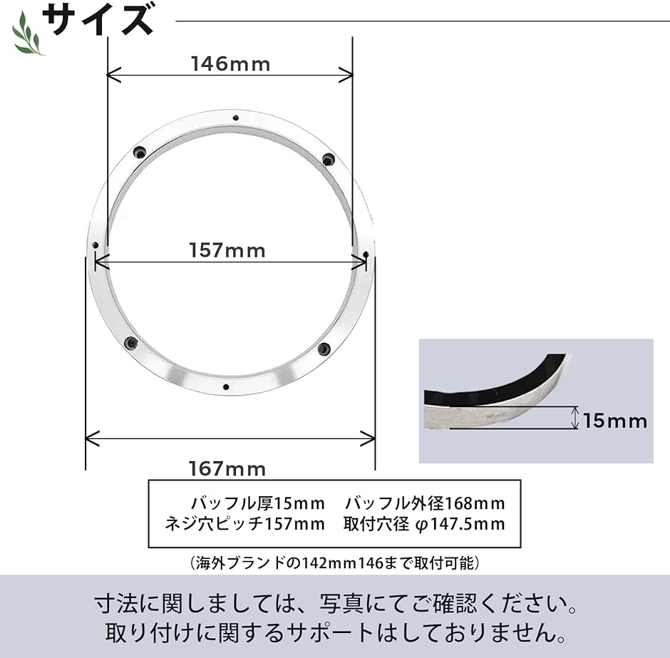 「サイズ」バッフル厚15mm/バッフル外径168mm/ネジ穴ピッチ157mm/取付穴径 φ147.5mm(海外ブランドの142mm146まで取付可能)