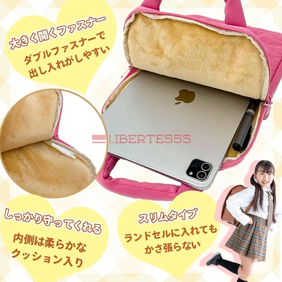 - 小学校で配布される10・11インチのタブレットが収納可能で、傷や衝撃、雨に強いウェットスーツ素材を使用したタブレットケース。軽量で150gと持ち運びに便利、ランドセルにもすっぽりと収まります。持ち手が付いているため、机のフックに掛けることが可能です。小学校の6年間使用することができ、女の子に人気のハート柄が施されています。また、トレンドのキルティング加工が施されているため、見た目もおしゃれです。「本体サイズ」29x22x2.2cm 「最大収納可能タブレットサイズ」10・11インチ ランドセルにすっぽり入ります。メーカーによりタブレットのサイズは多少変わる為、ご自身のサイズをご確認下さい。*商標登録商品※ 他ネットショップでも併売しているため、ご注文後に在庫切れとなる場合があります。予めご了承ください。※ 品薄または希少等の理由により、参考価格よりも高い価格で販売されている場合があります。ご注文の際には必ず販売価格をご確認ください。※ 沖縄県、離島または一部地域の場合、別途送料の負担をお願いする場合があります。予めご了承ください。※ お使いのモニタにより写真の色が実際の商品の色と異なる場合や、イメージに差異が生じることがあります。予めご了承ください。※ 商品の詳細(カラー・数量・サイズ 等)については、ページ内の商品説明をご確認のうえ、ご注文ください。※ モバイル版・スマホ版ページでは、お使いの端末によっては一部の情報が表示されないことがあります。すべての記載情報をご確認するには、PC版ページをご覧ください。