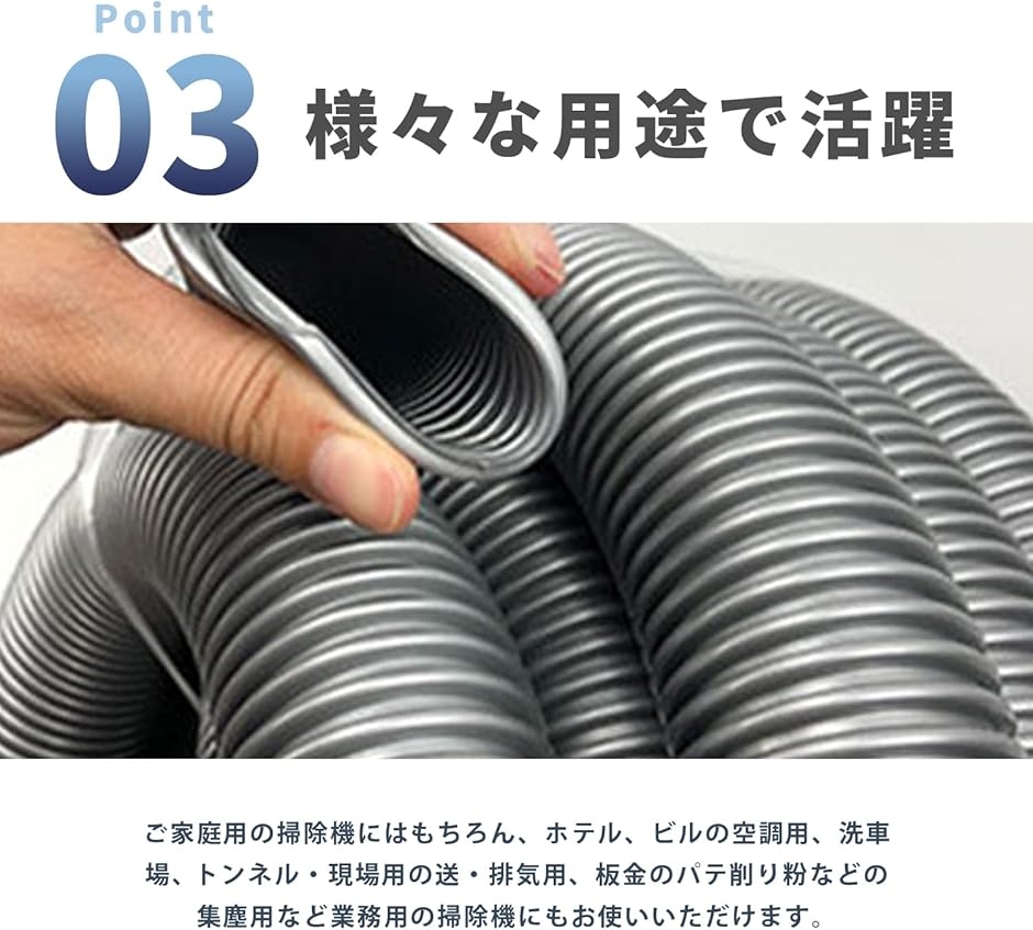 「様々な用途で活躍」ご家庭用の掃除機にはもちろん、ホテル、ビルの空調用、洗車場、トンネル・現場用の送・排気用、板金のパテ削り粉などの集塵用など業務用の掃除機にもお使いいただけます。