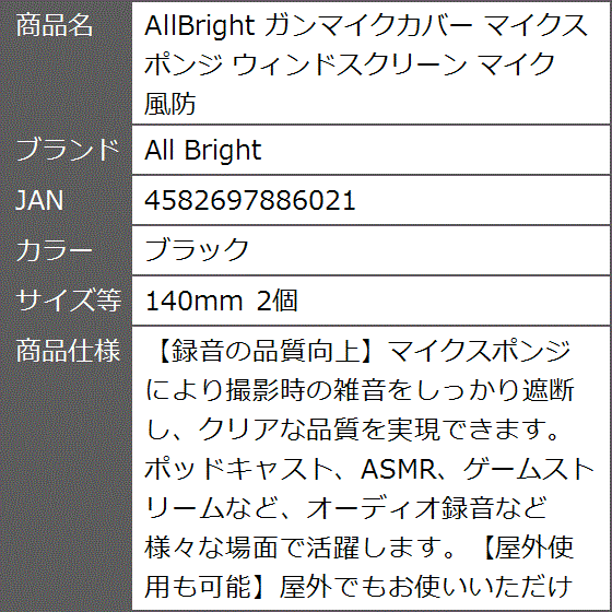 - 商品情報商品の説明主な仕様 【録音の品質向上】マイクスポンジにより撮影時の雑音をしっかり遮断し、クリアな品質を実現できます。ポッドキャスト、YouTube、ASMR、ゲームストリームなど、オーディオ録音など様々な場面で活躍します。【屋外使用も可能】屋外でもお使いいただけます。風切り音はもちろん、故障の原因となりやすいホコリや塵の侵入防止、もしもの際の傷や破損を防止するクッションとしての役割を果たします。【お手入れ簡単】スポンジ素材のため、使用後には水またはぬるま湯で洗う事が可能です。いつでも清潔にお使いいただけるため、インタビュー時のご使用にもオススメです。【商品詳細】個数2個、サイズ;長さ140mm、幅3.8cm、カラー:ブラック、適合モデル:sony 198P Z1C V1C ECM-XM1 ECM-673など【安心のサービス】All Brightオリジナルパッケージでお届けします。製品に何らかの不具合等がございましたら、購入後1年間は返品対応をさせて頂きますので安心してお使いください。商標登録6352053号