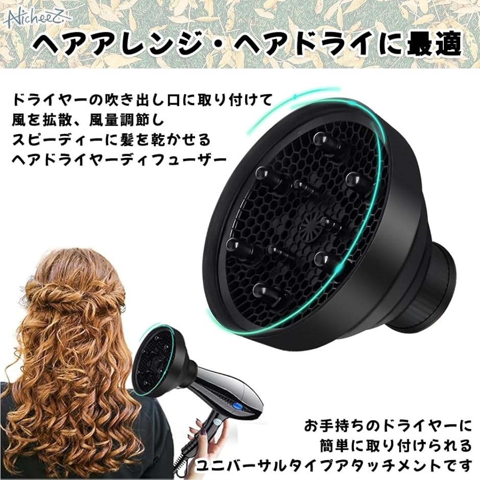 「ヘアアレンジ・ドライに最適」ドライヤーの吹き出し口に取り付けて風を拡散、風量を調節してスピーディーに髪を乾かすことができるヘアドライヤーディフューザーです。