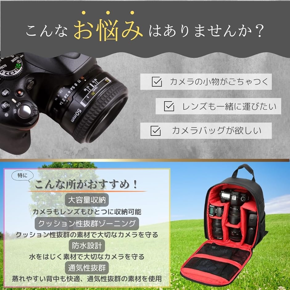 - バリエーションコード : 2b9us09lwx商品コード2b9us3khr5商品名カメラバック リュック 大容量 カメラ 仕切り 一眼レフ 多機能 バックパック 旅行 撮影 登り アウトドア 防水 軽量 三脚 男女兼用 日常用ブランドazumafyカラーレッドサイズ等大きめ「商品仕様」大容量カメラ用リュックになります。一眼レフもしっかり収納できる仕切りがついているタイプです。カメラだけでなく様々な用途でお使いいただけます。サイズ:25x34x15cm 重量:450g「デザイン」カジュアルなデザインで旅行や登山 散歩や撮影など様々な場面でお使いいただけます。内部には仕切りがついており、すっきりとした収納が出来ます。さらに衝突防止リバウンドスポンジでできており、バッグの中での衝突や擦れを防止してくれます。「機能」ショルダーストラップは簡単に調節可能で、あらゆる体型の方にも快適にお使いいただけます。カメラを収納するだけではなく、アクセサリーポケット、両側ボトル収納ポケット、三脚固定用ベルトもついており 多様な使い方が可能です。さらにカメラ用の仕切りは取り外すことも可能で、旅行などカメラ収納以外の使い方もできてとても便利です。「素材」表面は撥水ナイロン生地を使用しており、耐久性や防水性に優れています。*完全防水ではありません。ご注意下さい。*画像に移っているカメラ本体は付属いたしません。あくまで収納イメージです。予めご了承ください。※ 他ネットショップでも併売しているため、ご注文後に在庫切れとなる場合があります。予めご了承ください。※ 品薄または希少等の理由により、参考価格よりも高い価格で販売されている場合があります。ご注文の際には必ず販売価格をご確認ください。※ 沖縄県、離島または一部地域の場合、別途送料の負担をお願いする場合があります。予めご了承ください。※ お使いのモニタにより写真の色が実際の商品の色と異なる場合や、イメージに差異が生じることがあります。予めご了承ください。※ 商品の詳細(カラー・数量・サイズ 等)については、ページ内の商品説明をご確認のうえ、ご注文ください。※ モバイル版・スマホ版ページでは、お使いの端末によっては一部の情報が表示されないことがあります。すべての記載情報をご確認するには、PC版ページをご覧ください。