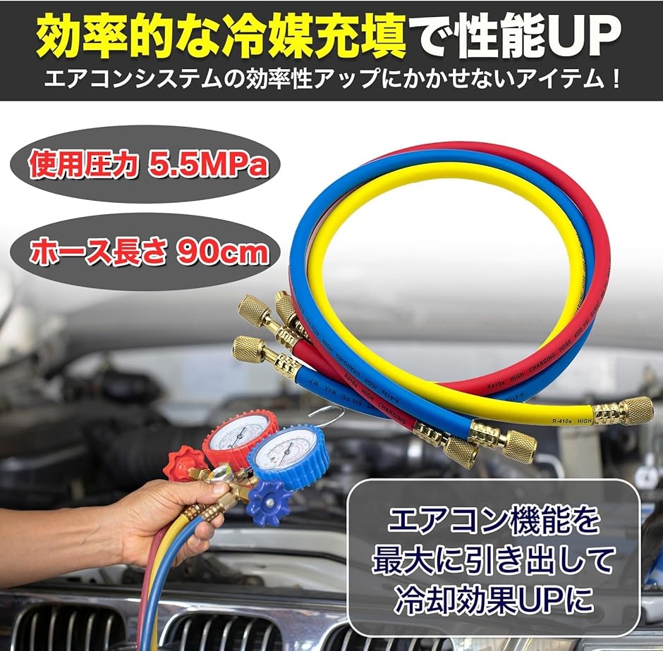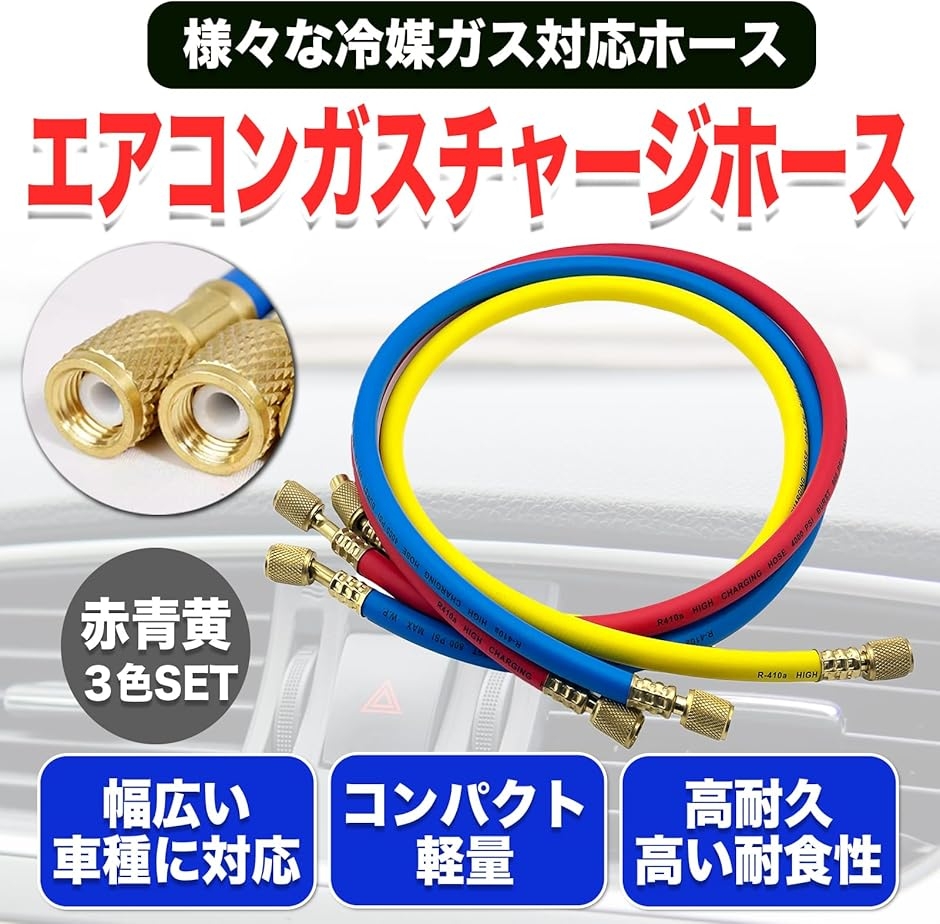 - バリエーションコード : 2bu2gufkco商品コード2b9rstch3n商品名MONOSTORE 汎用 エアコンガス チャージホース R410a R32 3本セット 1/4SAE 車 マニホールドゲージ カーエアコンブランドMONOSTOREカラーマルチカラーサイズ等90cm「高効率な冷媒充填」この汎用エアコンガス チャージホースは、R410a、R32の冷媒ガスに対応しているため、効率的な冷媒充填を実現します。これにより、カーエアコンの性能を引き出し、冷却効果を高めることができます。「高い互換性」このエアコン ガスチャージ ホースは、1/4フレア(UNF7/16-20)の接続口を採用しており、複数の車種や家庭用エアコンに対応できるため、汎用性が高く、複数の用途で活躍します。(マニホールドゲージは別売りになります)「高い耐久性」ホースは、耐久性に優れた素材で作られており、長期間の使用にも耐えられます。これにより、頻繁な交換の手間を省き、コストパフォーマンスを向上させます。コンパクトなサイズで、持ち運びが容易です。これにより、現場での作業がスムーズに行え、時間と労力を節約できます。どこでも手軽に使用できる便利さが魅力です。「商品仕様」長さ:全長90cm、120cmの2種類 ・3本セット(レッド・ブルー・イエロー)常用圧力:5.5Mpa(800psi) 限界圧力:27.5Mpa(4000psi)「使用上の注意事項」接続口径は5/16フレアではありませんのでご注意ください。取扱説明書などはありません。エアコン修理には専門知識が必要になります。専門業者様または専門の知識がある方向けの商品になります。取り付けによる破損、接続不良等、責任を負いかねますので専門業者様に依頼するかご自身の責任でお取り付けください。本商品を使用した際に発生したトラブル、事故につきましては、一切の責任を負いかねます。ご使用方法や専門的なご質問に関するサポート等は行っておりません。商品はモニターによって色合いが異なって見える場合があります。※ 他ネットショップでも併売しているため、ご注文後に在庫切れとなる場合があります。予めご了承ください。※ 品薄または希少等の理由により、参考価格よりも高い価格で販売されている場合があります。ご注文の際には必ず販売価格をご確認ください。※ 沖縄県、離島または一部地域の場合、別途送料の負担をお願いする場合があります。予めご了承ください。※ お使いのモニタにより写真の色が実際の商品の色と異なる場合や、イメージに差異が生じることがあります。予めご了承ください。※ 商品の詳細(カラー・数量・サイズ 等)については、ページ内の商品説明をご確認のうえ、ご注文ください。※ モバイル版・スマホ版ページでは、お使いの端末によっては一部の情報が表示されないことがあります。すべての記載情報をご確認するには、PC版ページをご覧ください。