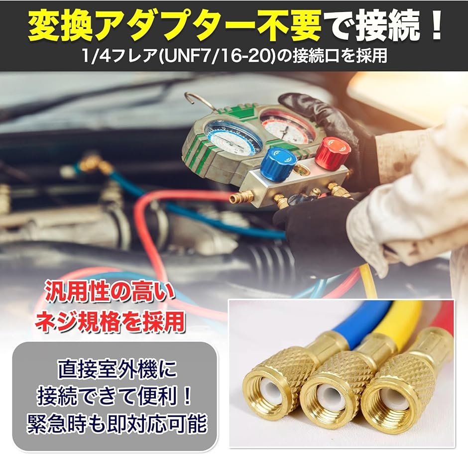 「高い互換性」このエアコン ガスチャージ ホースは、1/4フレア(UNF7/16-20)の接続口を採用しており、複数の車種や家庭用エアコンに対応できるため、汎用性が高く、複数の用途で活躍します。