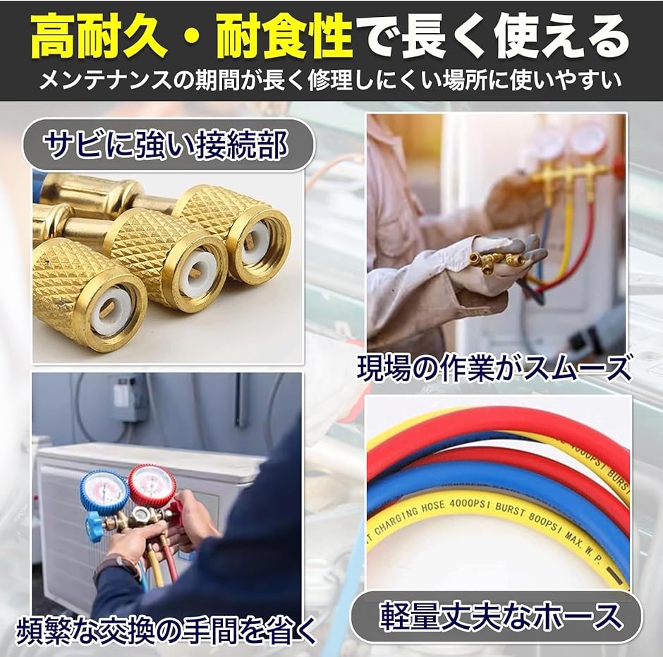 「高効率な冷媒充填」この汎用エアコンガス チャージホースは、R410a、R32の冷媒ガスに対応しているため、効率的な冷媒充填を実現します。