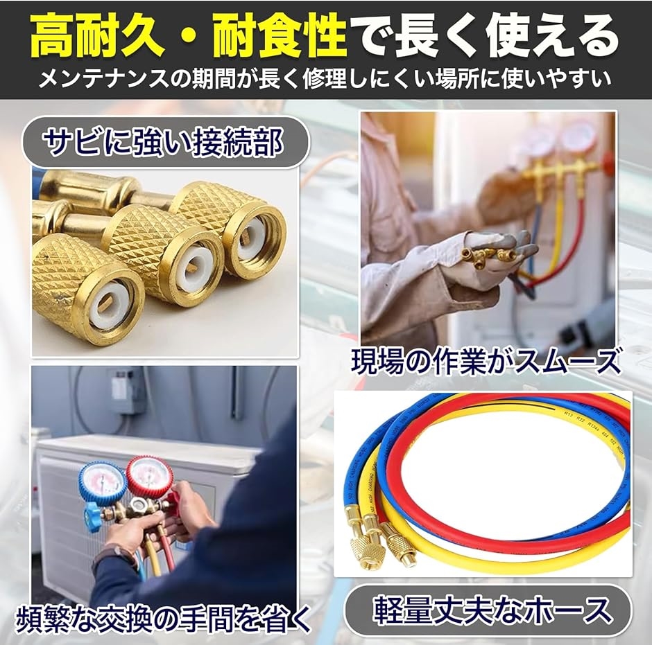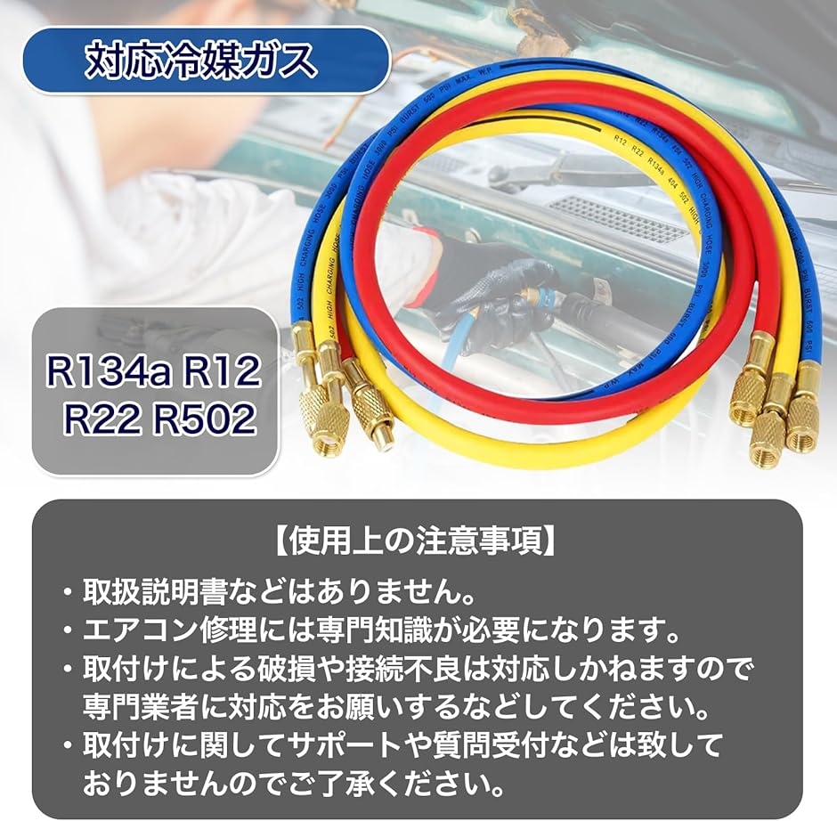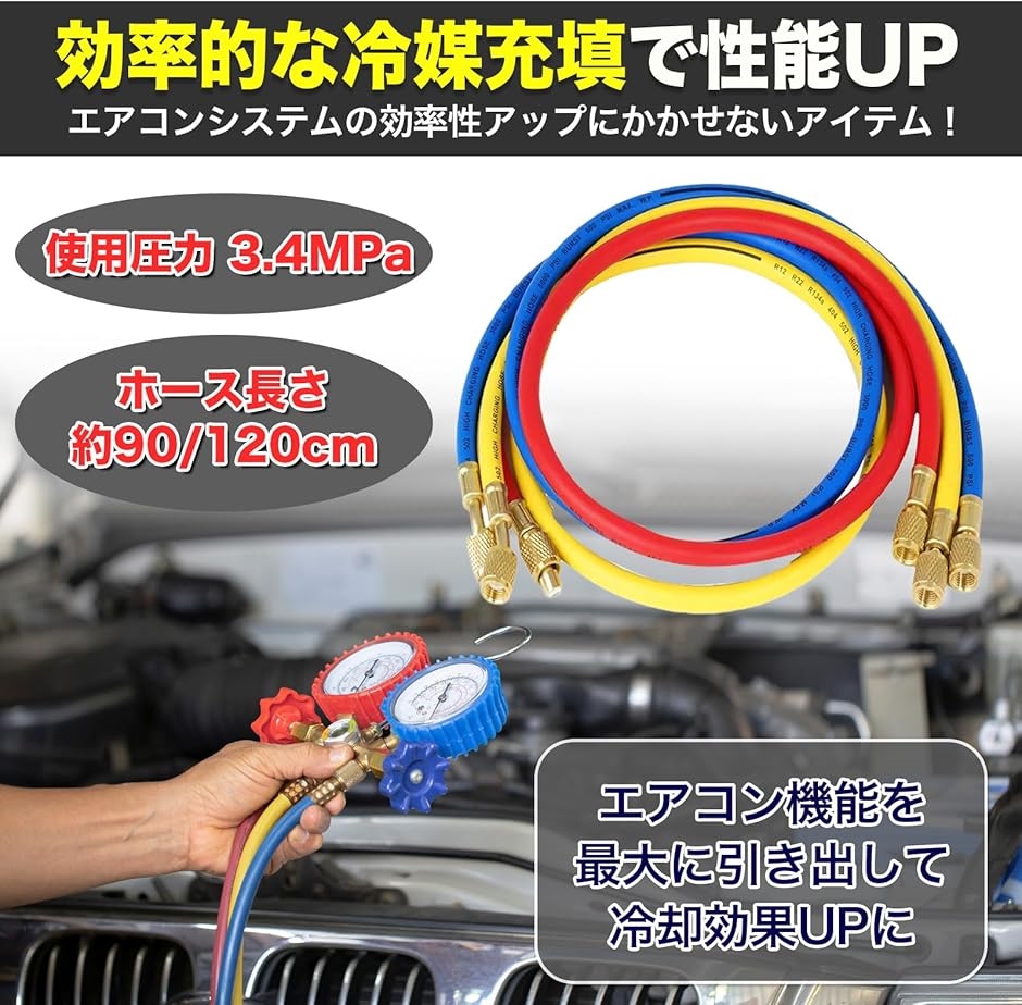 - MONOSTORE 汎用 エアコンガス チャージホース 3本セット R134a R12 R22 R502 対応 1/4 車 マニホールドゲージ 120cm 【高効率な冷媒充填】この汎用エアコンガス チャージホースは、R134a、R12、R22、R502の冷媒ガスに対応しています。効率的な冷媒充填を実現。これにより、カーエアコンの性能を引き出し、冷却効果を高めることができます。 【高い互換性】このエアコン ガスチャージ ホースは、1/4フレア(UNF7/16-20)の接続口を採用しており、複数の車種や家庭用エアコンに対応できるため、汎用性が高く、複数の用途で活躍します。(マニホールドゲージは別売りになります) 【高い耐久性】耐久性に優れた素材で作られており、長期間の使用にも耐えられます。これにより、頻繁な交換の手間を省き、コストパフォーマンスを向上させます。コンパクトなサイズで、持ち運びが容易です。これにより、現場での作業がスムーズに行え、時間と労力を節約できます。どこでも手軽に使用できる便利さが魅力です。 【商品仕様】3本セット(レッド・ブルー・イエロー)サイズは約90cmと約120cmの2種類。 常用圧力:3.4MPa 限界圧力:17.2MPa 【使用上の注意事項】取扱説明書などはありません。エアコン修理には専門知識が必要になります。専門業者様または専門の知識がある方向けの商品になります。取り付けによる破損、接続不良等、責任を負いかねますので専門業者様に依頼するかご自身の責任でお取り付けください。本商品を使用した際に発生したトラブル、事故につきましては、一切の責任を負いかねます。ご使用方法や専門的なご質問に関するサポート等は行っておりません。商品はモニターによって色合いが異なって見える場合があります。 商品コード62080974405商品名MONOSTORE 汎用 エアコンガス チャージホース 3本セット R134a R12 R22 R502 対応 1/4 車 マニホールドゲージ 120cm型番201220150610サイズ120cmカラーマルチカラー※他モールでも併売しているため、タイミングによって在庫切れの可能性がございます。その際は、別途ご連絡させていただきます。※他モールでも併売しているため、タイミングによって在庫切れの可能性がございます。その際は、別途ご連絡させていただきます。
