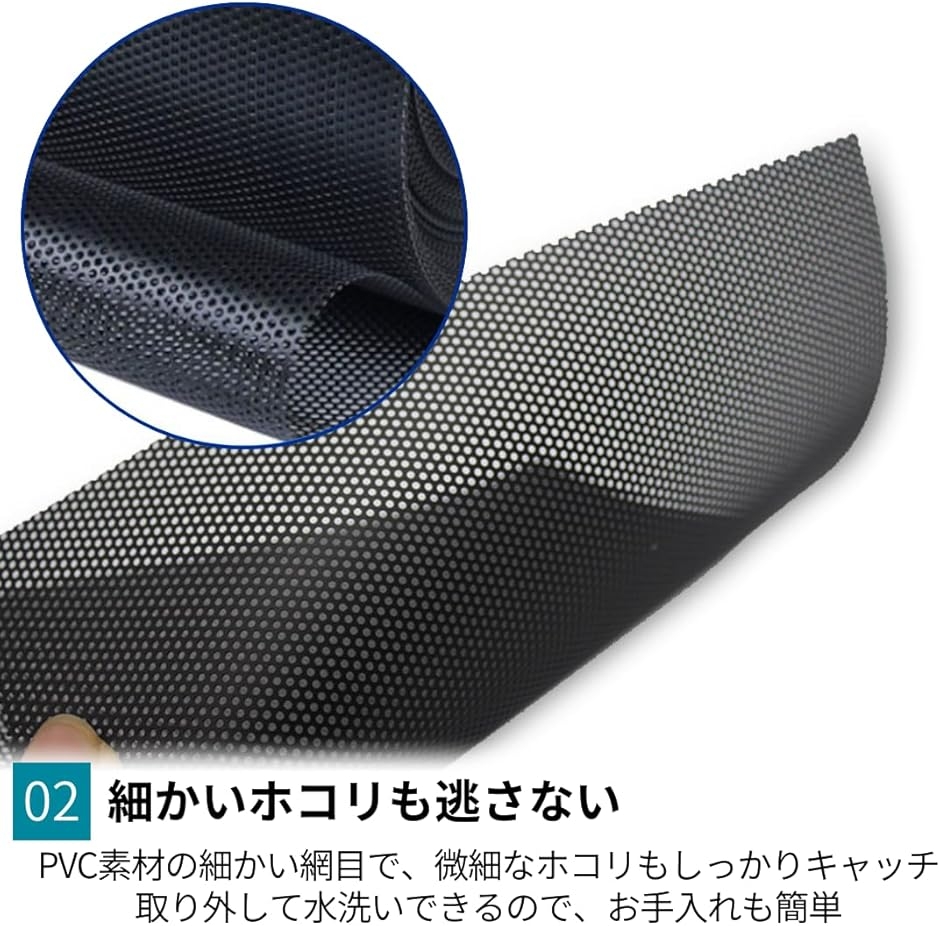 「細かい網目で微細なホコリも徹底ブロック」PVC素材の細かい網目構造で、微細なホコリもしっかりキャッチ。フィルター表面のチリやホコリをこまめに取り除くことで、清潔感と通気性の両立を実現し、PCを長持ちさせます。