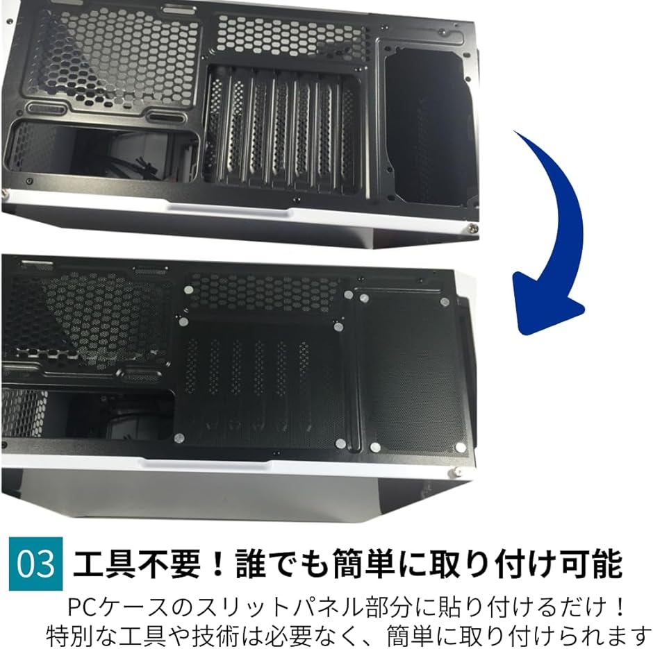 PCケースのスリットパネル部分に取り付けることで、ホコリがパソコンケース内部に侵入するのを防ぎます。