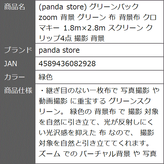 - (panda store) グリーンバック 背景 グリーン 布 背景布 クロマキー 1.8m×2.8m スクリーン クリップ4点 撮影 背景 zoom 使いやすいサイズのグリーンバック(4つクリップ付)!! 1.8m×2.8mと使いやすいサイズのグリーンバックです。強力クリップ4つ付属してすぐに使用していただけます。撮影やzoomの背景に使用していただけます。 5