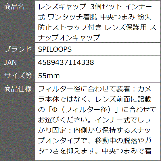 レンズキャップ 3個セット インナー式 ワンタッチ着脱 中央つまみ 紛失防止ストラップ付き レンズ保護用 (55mm)
