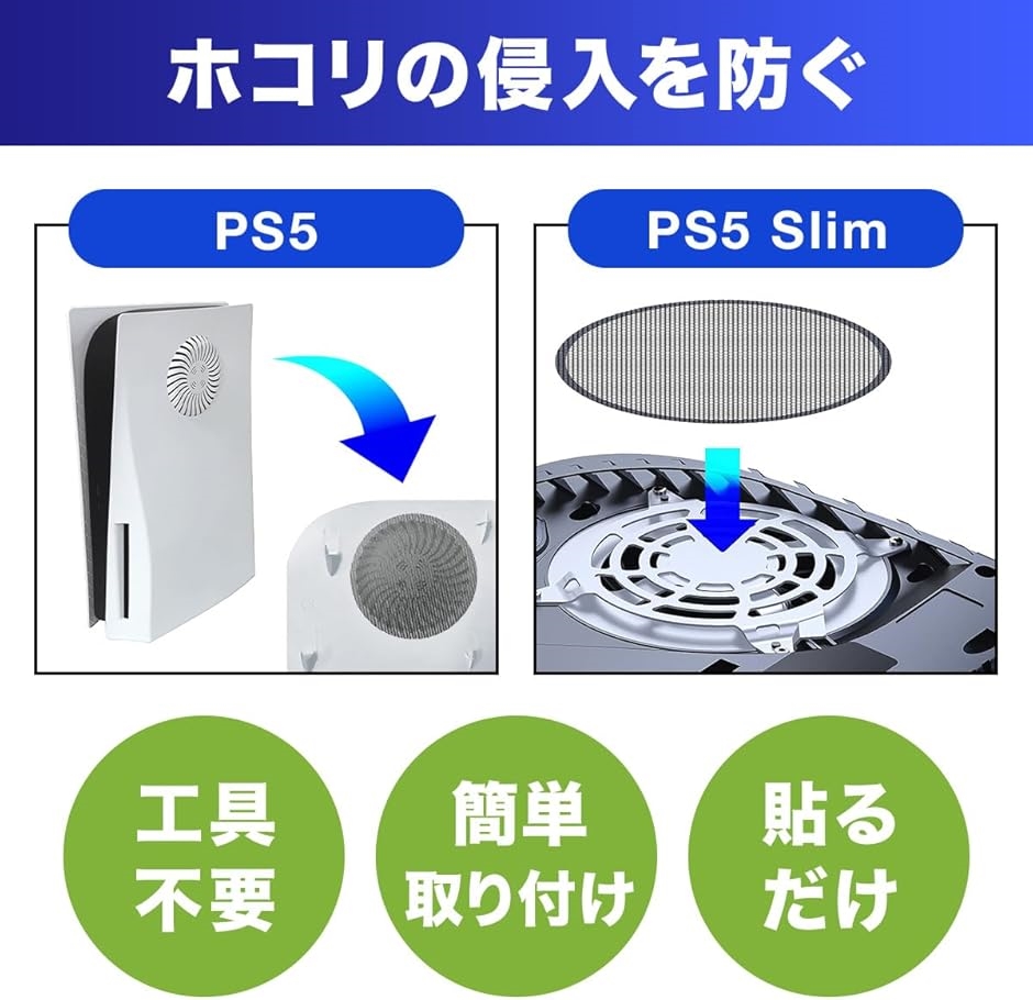 - 「PlayStation5 & PlayStation5Slim専用設計」 PS5専用に設計されておりファンや通気口にぴったりフィットしてずれることがありません。本体の動作を妨げることなく安定したパフォーマンスをサポートします。「パフォーマンスの向上と寿命延長」 ファンにフィルターを付ける事により埃をしっかりとブロックします。本体内部を清潔に保ち、パフォーマンスの向上と寿命の延長に役立ちます。「簡単取り付け」 フィルムを剥がして貼るだけの簡単設置。*取り付け前にエアダスターでファン内部を綺麗にしてからご使用下さい。「サイズ」 PS5とPS5Slimは取り付け部分のサイズが違います。PS5はフェイスプレートに取り付け、PS5Slimはファンに直接設置します。*どちらも専用設計になっていますのでお持ちのPS5種類を選択して下さい。※ 他ネットショップでも併売しているため、ご注文後に在庫切れとなる場合があります。予めご了承ください。※ 品薄または希少等の理由により、参考価格よりも高い価格で販売されている場合があります。ご注文の際には必ず販売価格をご確認ください。※ 沖縄県、離島または一部地域の場合、別途送料の負担をお願いする場合があります。予めご了承ください。※ お使いのモニタにより写真の色が実際の商品の色と異なる場合や、イメージに差異が生じることがあります。予めご了承ください。※ 商品の詳細(カラー・数量・サイズ 等)については、ページ内の商品説明をご確認のうえ、ご注文ください。※ モバイル版・スマホ版ページでは、お使いの端末によっては一部の情報が表示されないことがあります。すべての記載情報をご確認するには、PC版ページをご覧ください。
