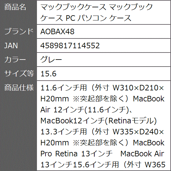- バリエーションコード : 2b4tg2juf4商品コード2b4tg4f9ss商品名マックブックケース マックブック ケース PC パソコン ケースブランドAOBAX48カラーグレーサイズ等15.611.6インチ用(外寸 W310xD210xH20mm *突起部を除く)MacBook Air 12インチ(11.6インチ)、MacBook12インチ(Retinaモデル)13.3インチ用(外寸 W335xD240xH20mm *突起部を除く)MacBook Pro Retina 13インチ MacBook Air 13インチ15.6インチ用(外寸 W365xD255xH20mm *突起部を除く)MacBook Pro Retina 15インチ MacBook Pro 15インチ*画像は、ご覧になっているモニターやPCなどの環境により、実物と多少カラーが異なる場合がございます。色味やサイズが異なるなどのクレームはご対応致しかねますので、ご了承ください。※ 他ネットショップでも併売しているため、ご注文後に在庫切れとなる場合があります。予めご了承ください。※ 品薄または希少等の理由により、参考価格よりも高い価格で販売されている場合があります。ご注文の際には必ず販売価格をご確認ください。※ 沖縄県、離島または一部地域の場合、別途送料の負担をお願いする場合があります。予めご了承ください。※ お使いのモニタにより写真の色が実際の商品の色と異なる場合や、イメージに差異が生じることがあります。予めご了承ください。※ 商品の詳細(カラー・数量・サイズ 等)については、ページ内の商品説明をご確認のうえ、ご注文ください。※ モバイル版・スマホ版ページでは、お使いの端末によっては一部の情報が表示されないことがあります。すべての記載情報をご確認するには、PC版ページをご覧ください。シンプルで洗練されたデザイン、11.6インチ、13.3インチ、15.6インチの各サイズに対応し、どんなノートパソコンにもぴったりフィット。柔らかくなめらかな素材を使用しており、大事なノートパソコンを傷から守りながら、持ち運び時の負担も軽減します。このケースはスリムでコンパクトな設計が特徴で、重さを感じさせない軽量設計です。内外面ともに柔らかい素材で覆われているため、デバイスを優しく保護。大きく開くダブルファスナー設計により、ノートパソコンの出し入れもスムーズに行えます。ビジネスシーンからカジュアルな使用まで、幅広いシチュエーションで活躍するこのケースは、大学生から社会人まで、とてもおすすめです。色のバリエーションも豊富で、自分のスタイルに合わせて選べるのも魅力の一つです。*注意事項* *画像は、ご覧になっているモニターやPCなどの環境により、実物と多少カラーが異なる場合がございます。色味やサイズが異なるなどのクレームはご対応致しかねますので、ご了承ください。