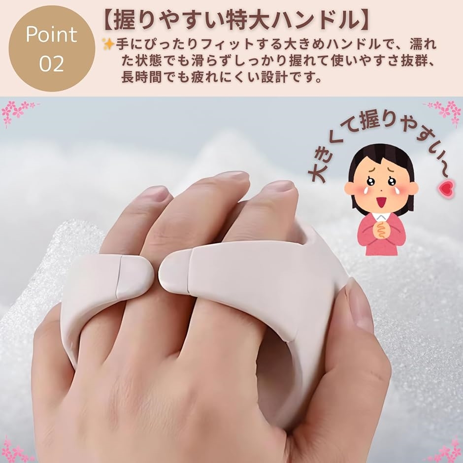 「握りやすい特大ハンドル」 手にぴったりフィットする大きめハンドルで、濡れた状態でも滑らずしっかり握れて使いやすさ抜群、長時間でも疲れにくい設計です。