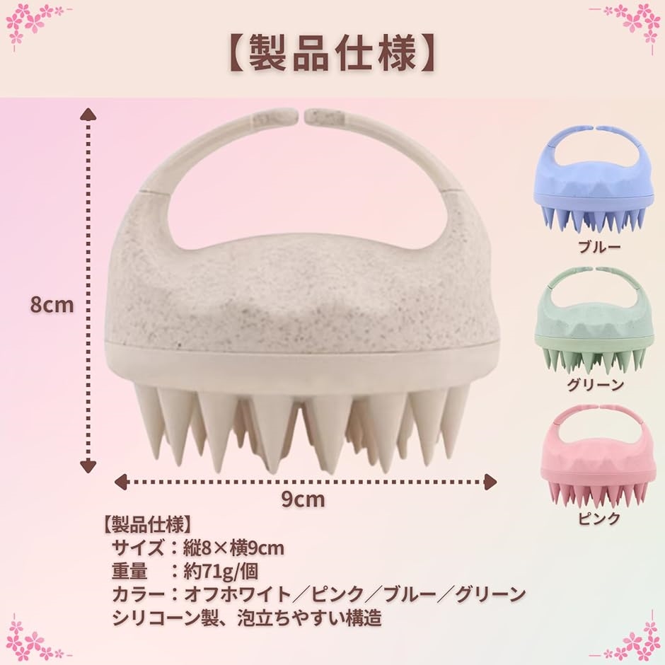 「製品仕様」 サイズ:縦8x横9cm(1個)、重量:71g/個、カラー:オフホワイト/ピンク/ブルー/グリーン、シリコーン製、泡立ちやすい構造、2個セット。 - 楽天での商品説明(ホリック)