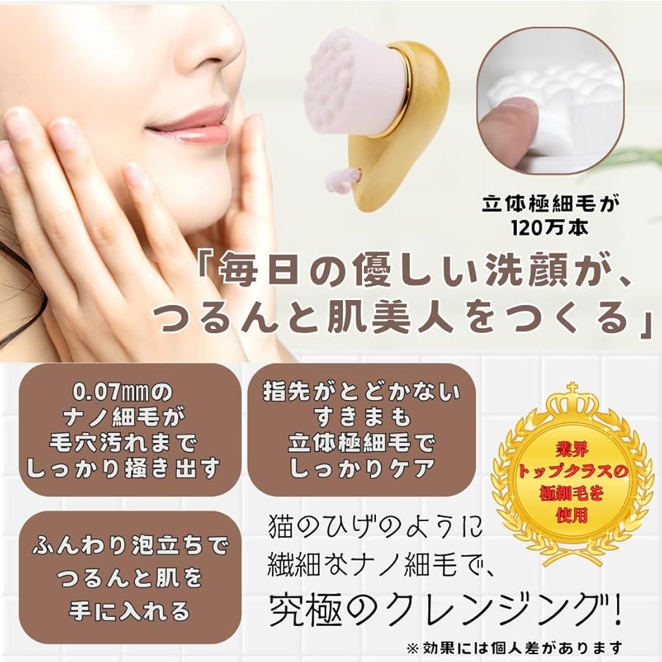 「極細毛120万本の濃密ブラシで毛穴洗浄を徹底サポート」 髪の毛と同等の細さ0.07mmの極細毛が、顔全体の毛穴にしっかりフィット。