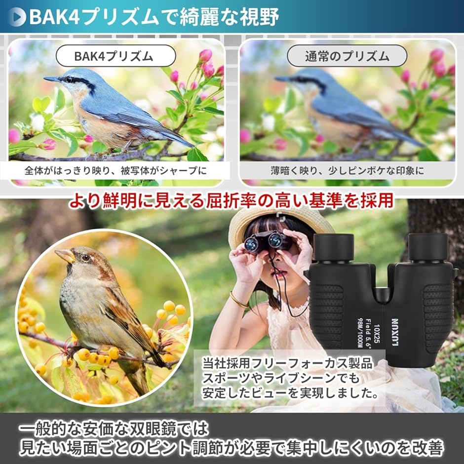 フリーフォーカス双眼鏡 面倒なピント調整が一切不要 スポーツなど激しい動きにもしっかり対応 勝手にピントが合ってくれるので決定的な場面も見逃す心配がありません アイレリーフ(レンズから目までの適切な距離)20mmのハイアイポイント仕様 目とレンズが少し離れているから疲れにくく、メガネをかけたままでも使用OK. マルチコートレンズ採用:反射を抑えて自然と明るく見えるレンズです。